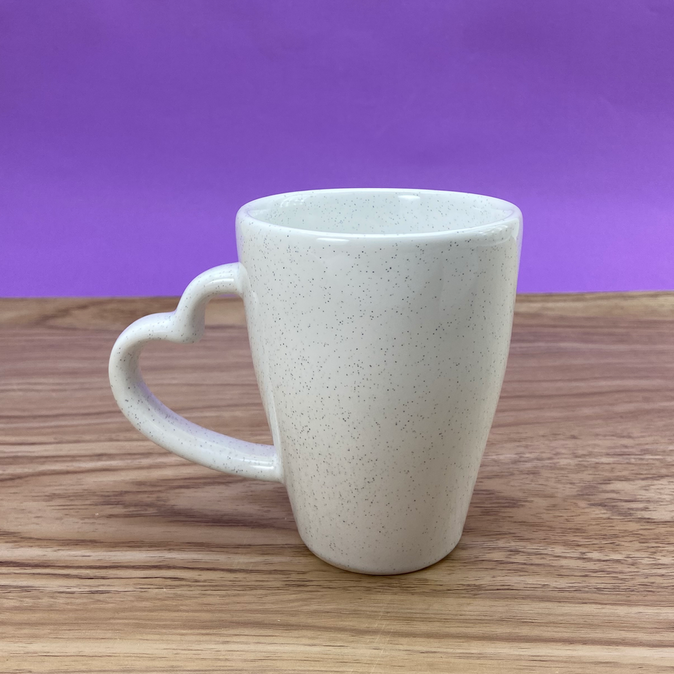 Taza de cerámica color beige con diseño jaspeado con asa en forma de corazón