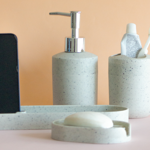 Diseño minimalista con colores neutros con diseño "stone", ideal para combinar en cualquier baño