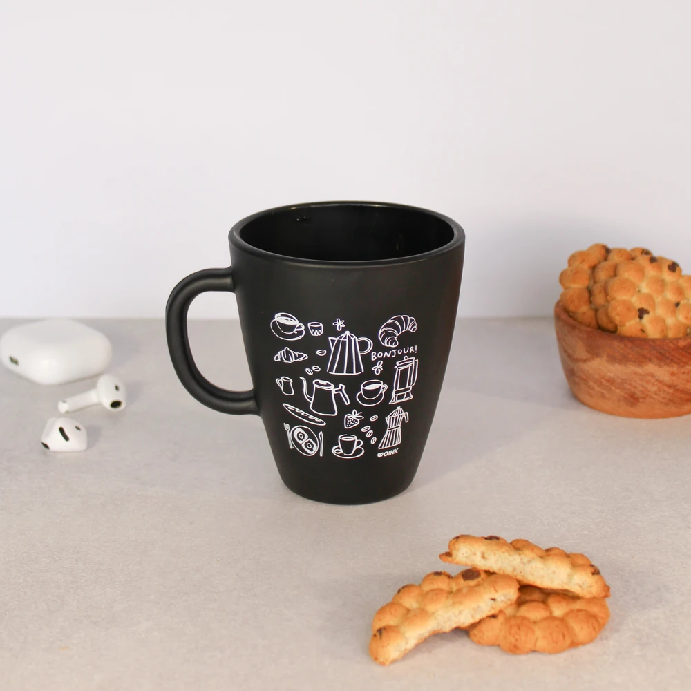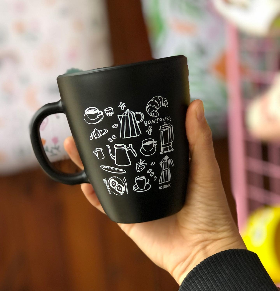 Taza negra de ceramica con diseño estampado