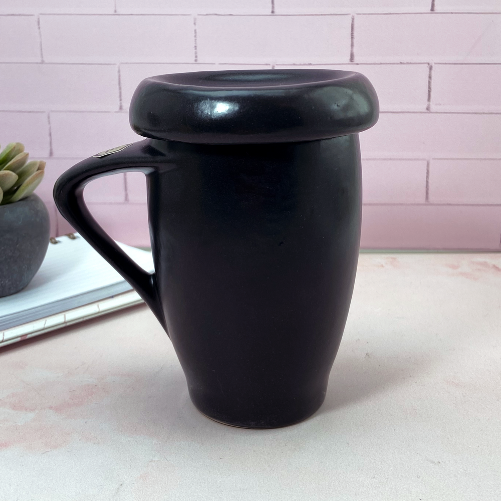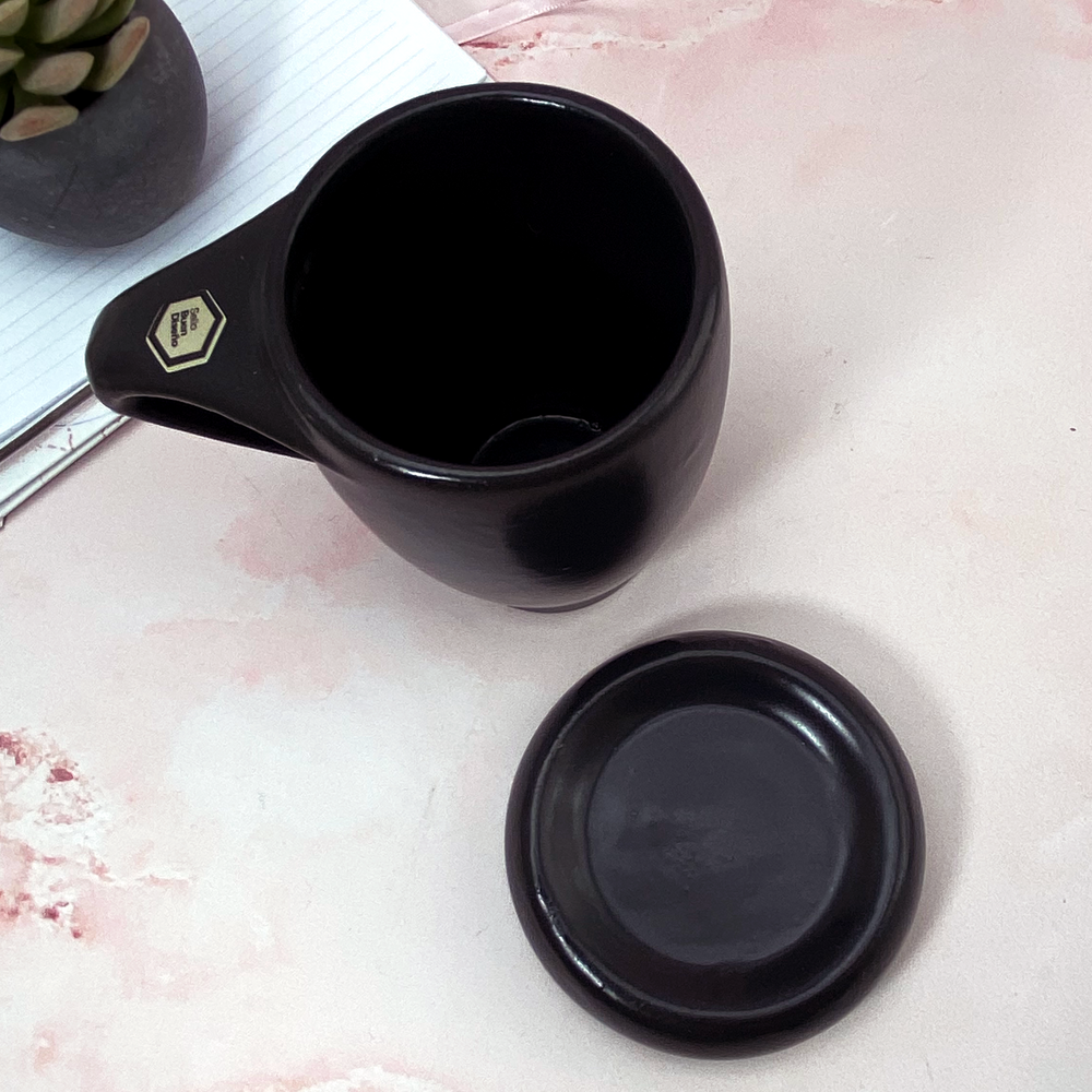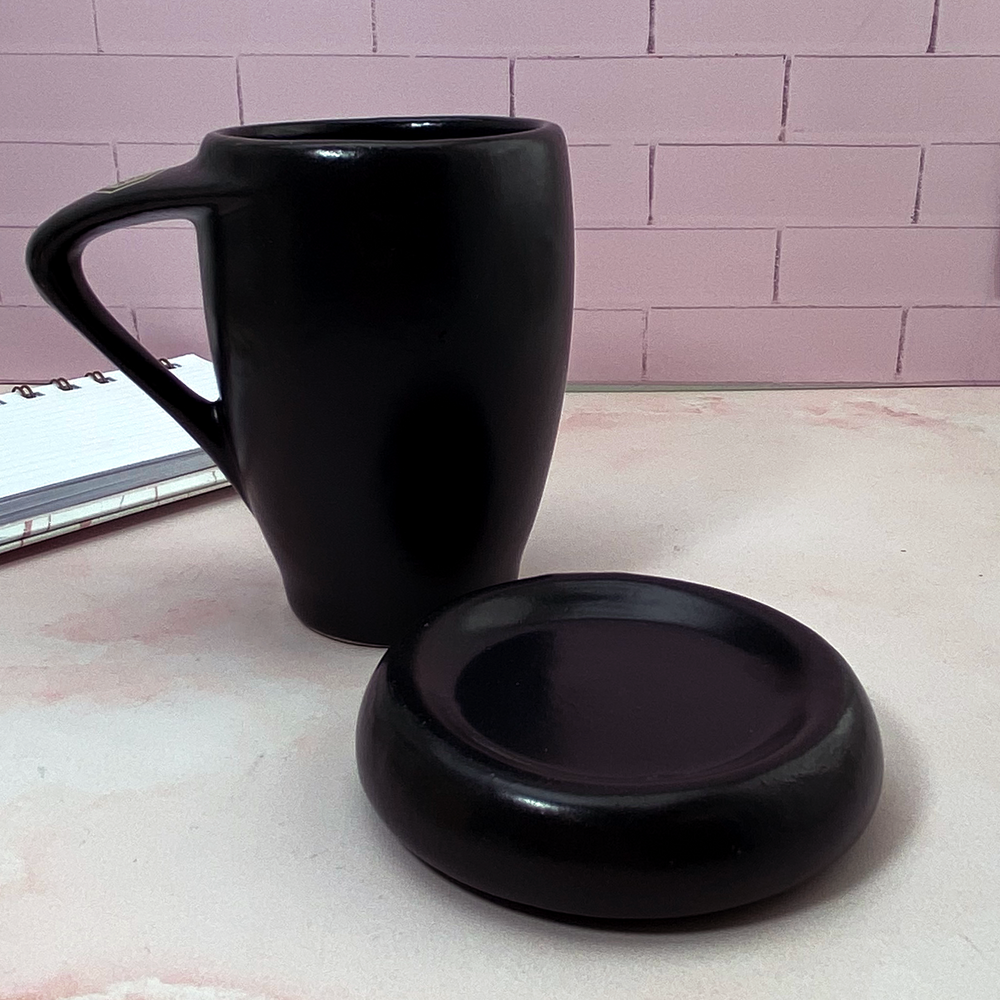 Taza de diseño, ideal para el café. Con tapa que mantiene la temperatura por más tiempo, también puede usarse como un pequeño plato ideal para apoyar la cuchara o una galletita.