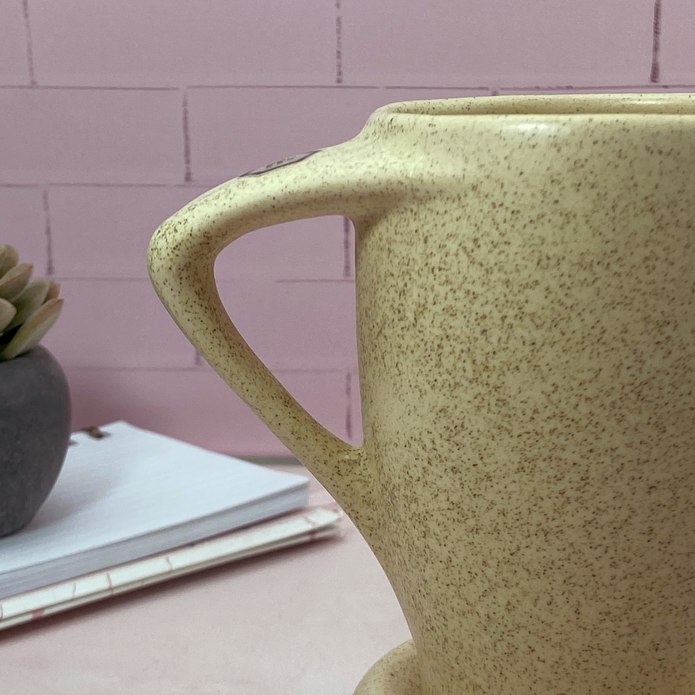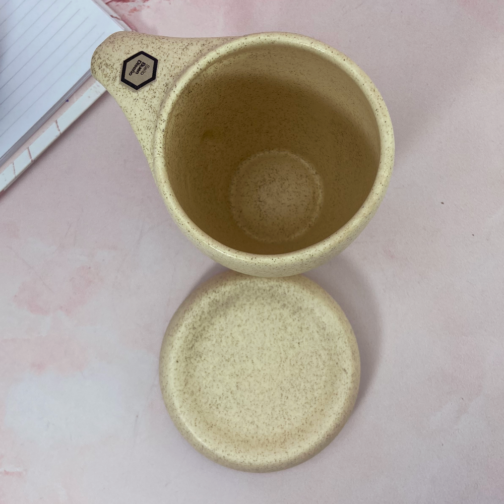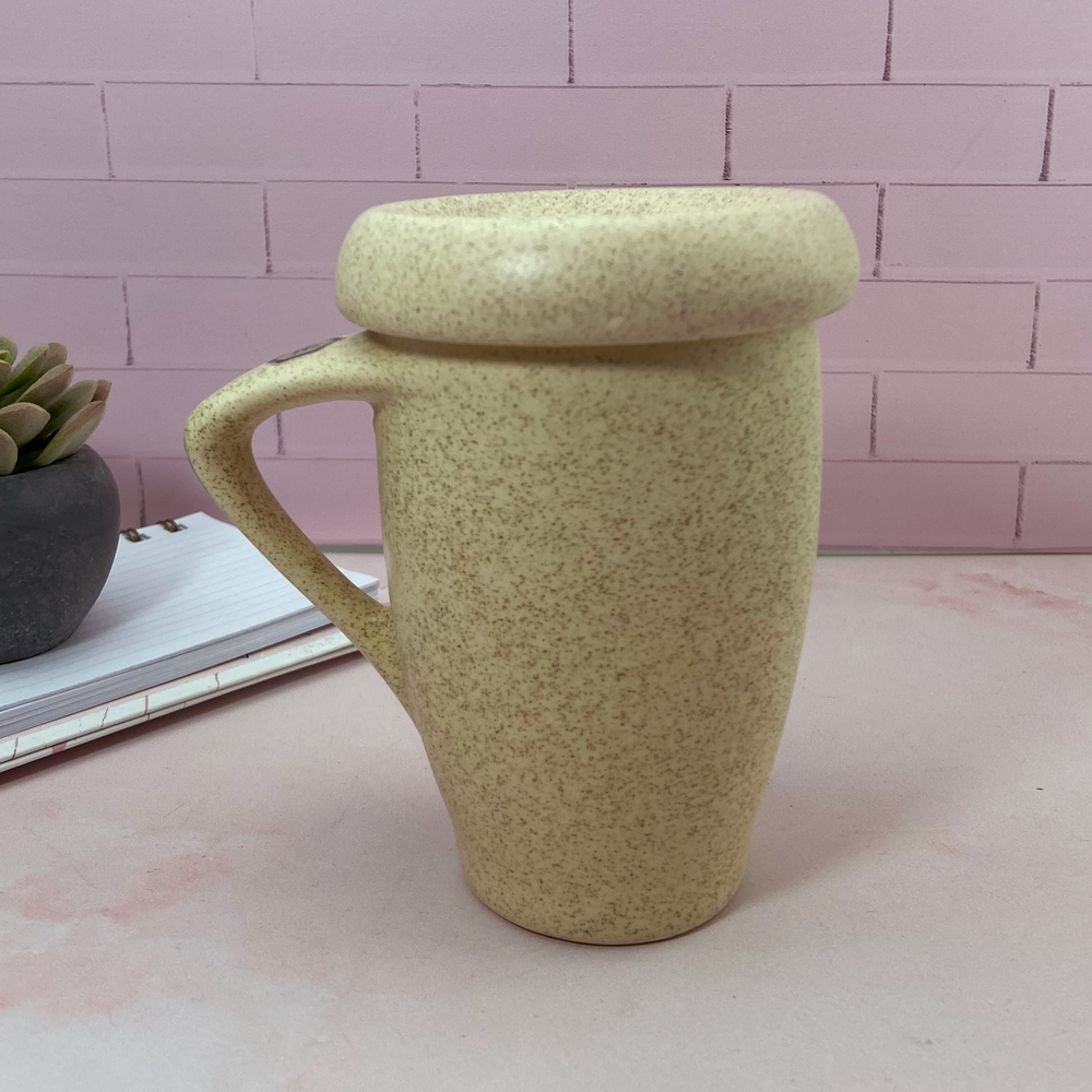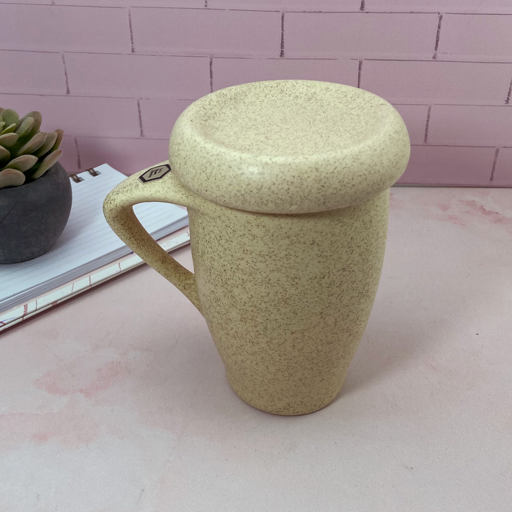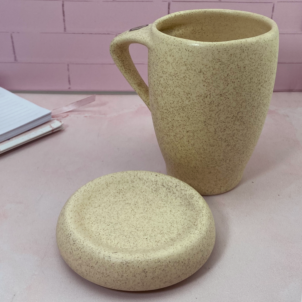 Taza de diseño, ideal para el café. Con tapa que mantiene la temperatura por más tiempo, también puede usarse como un pequeño plato ideal para apoyar la cuchara o una galletita.