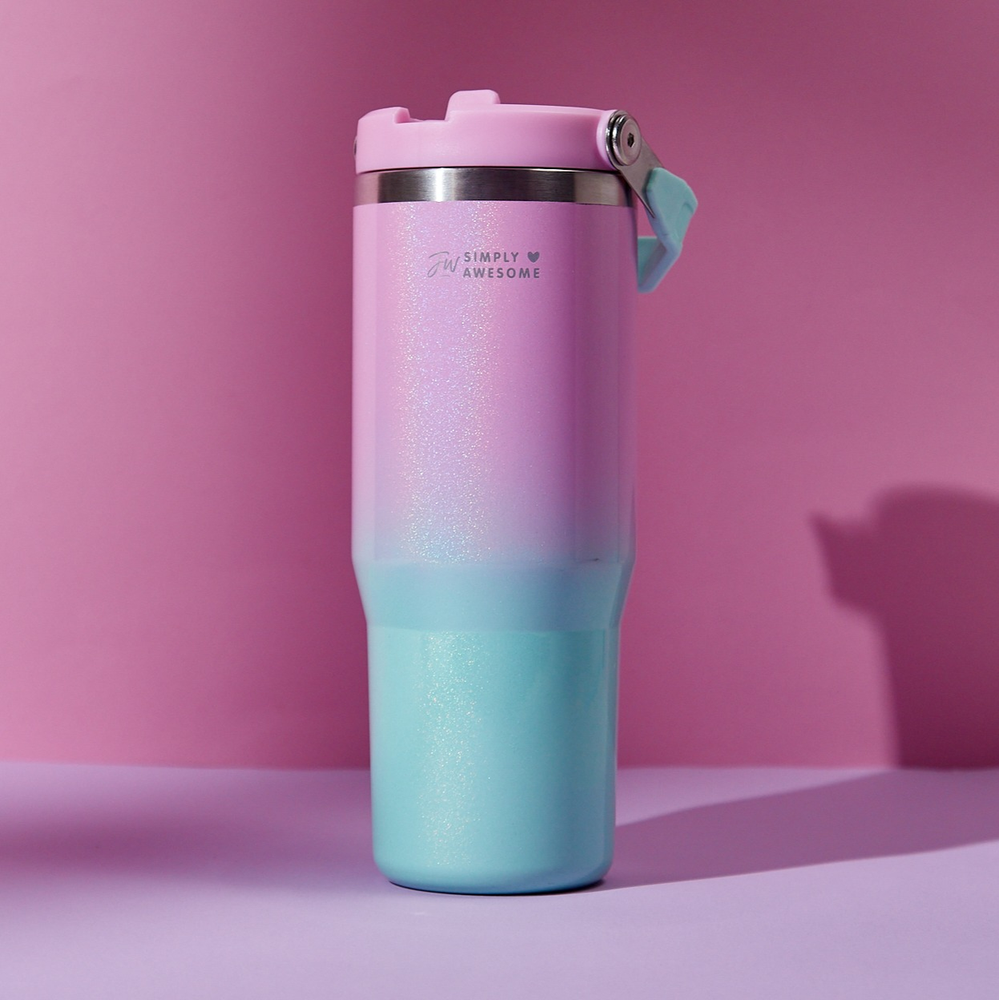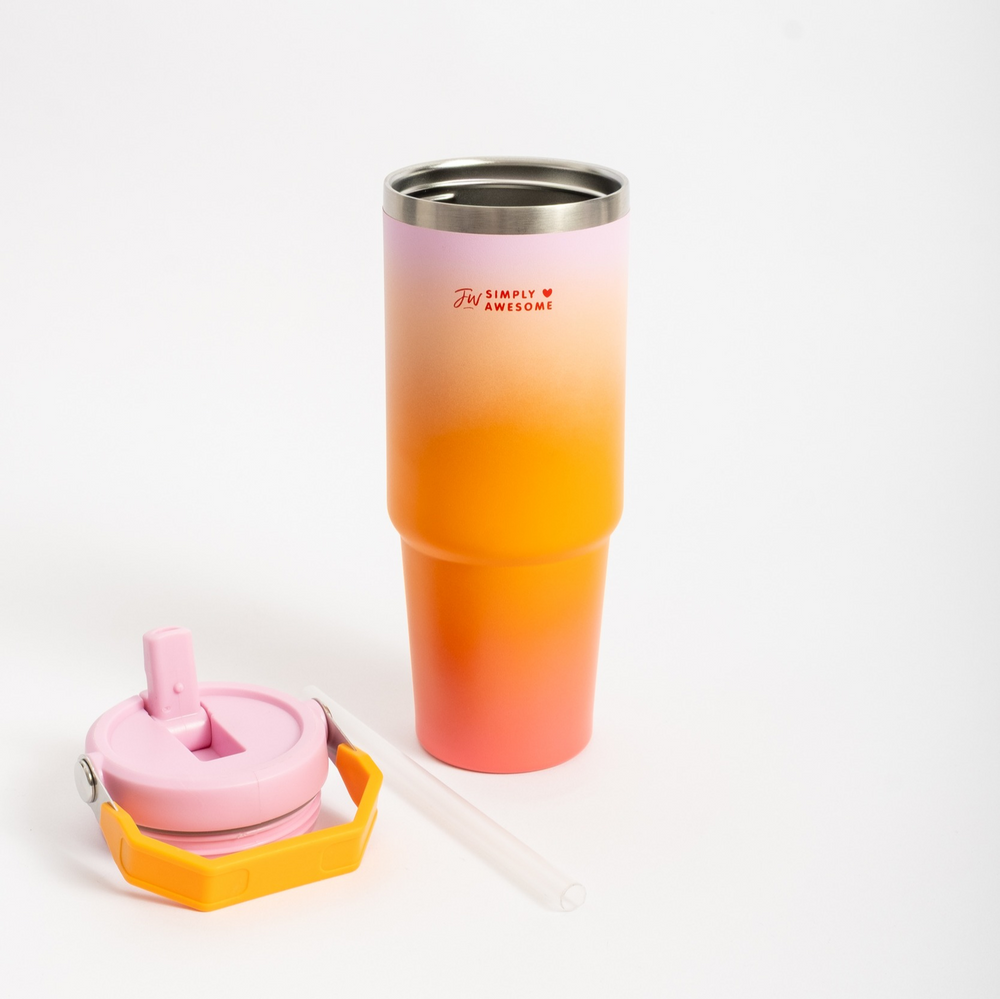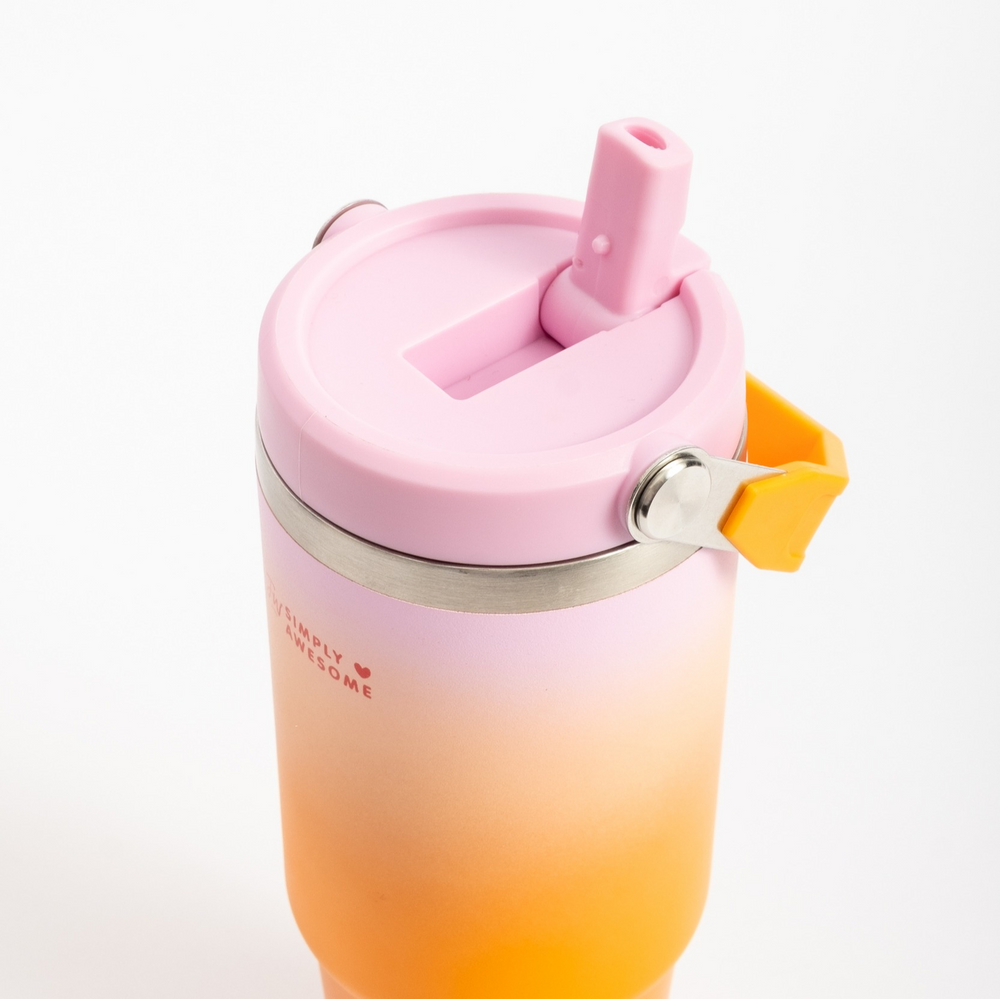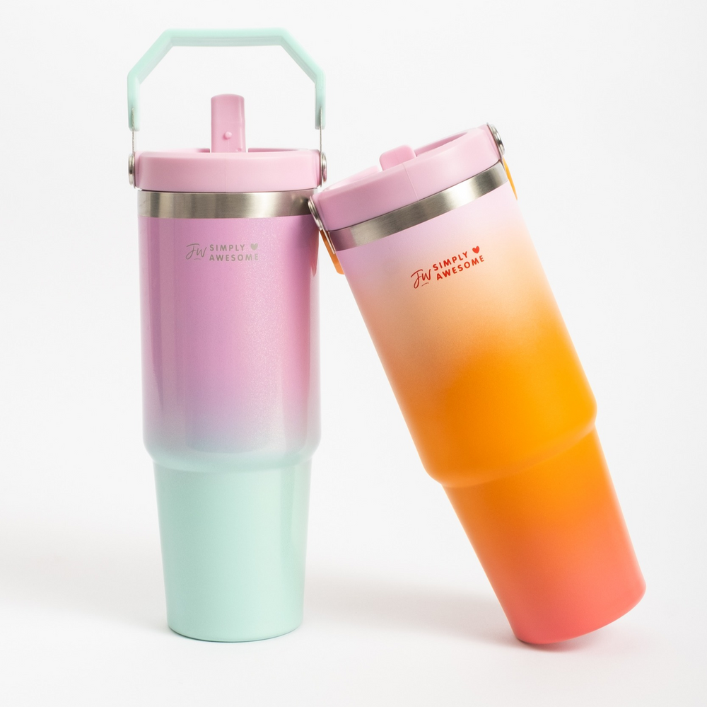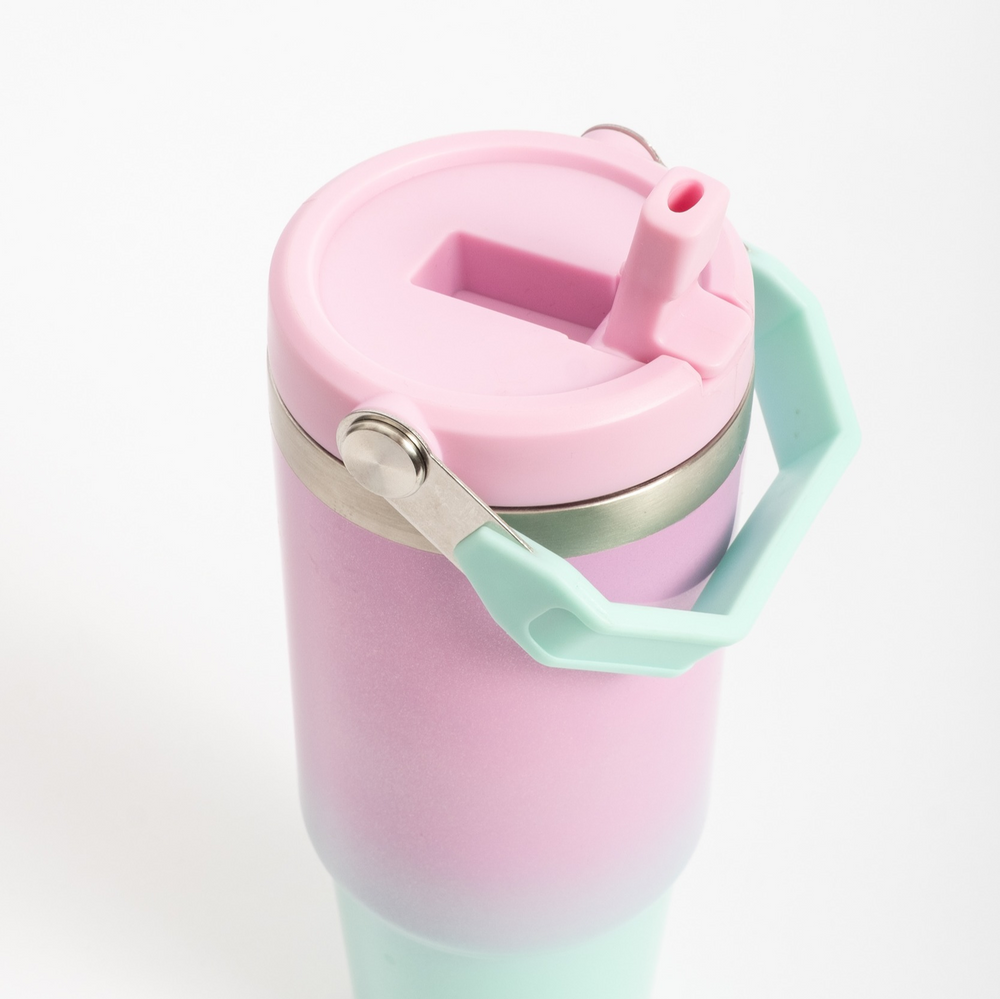 Vaso térmico de 880 ml (30 oz) en acero inoxidable de doble pared, mantiene la temperatura hasta por 12 horas. Libre de BPA. Dos variantes de diseño: rosa degrade naranja y rosa degrade celeste con glitter.