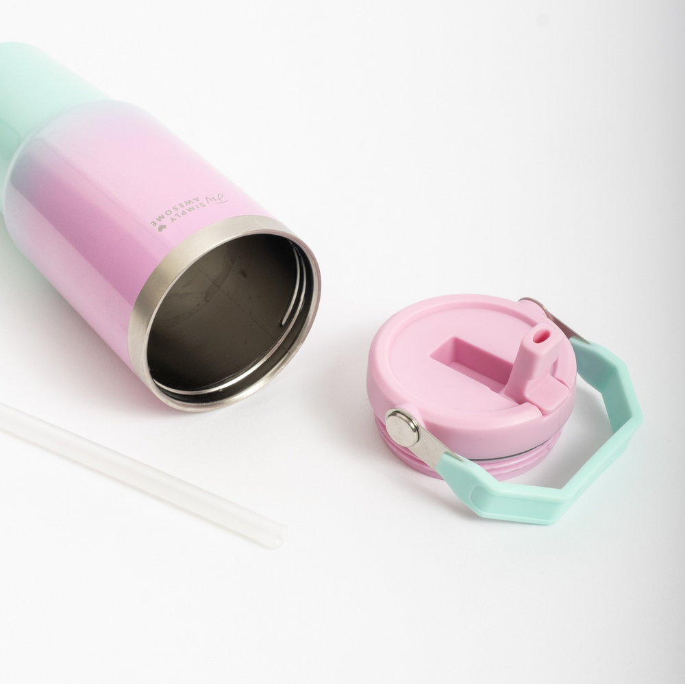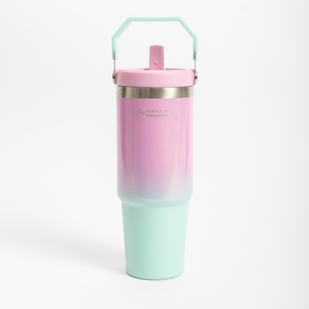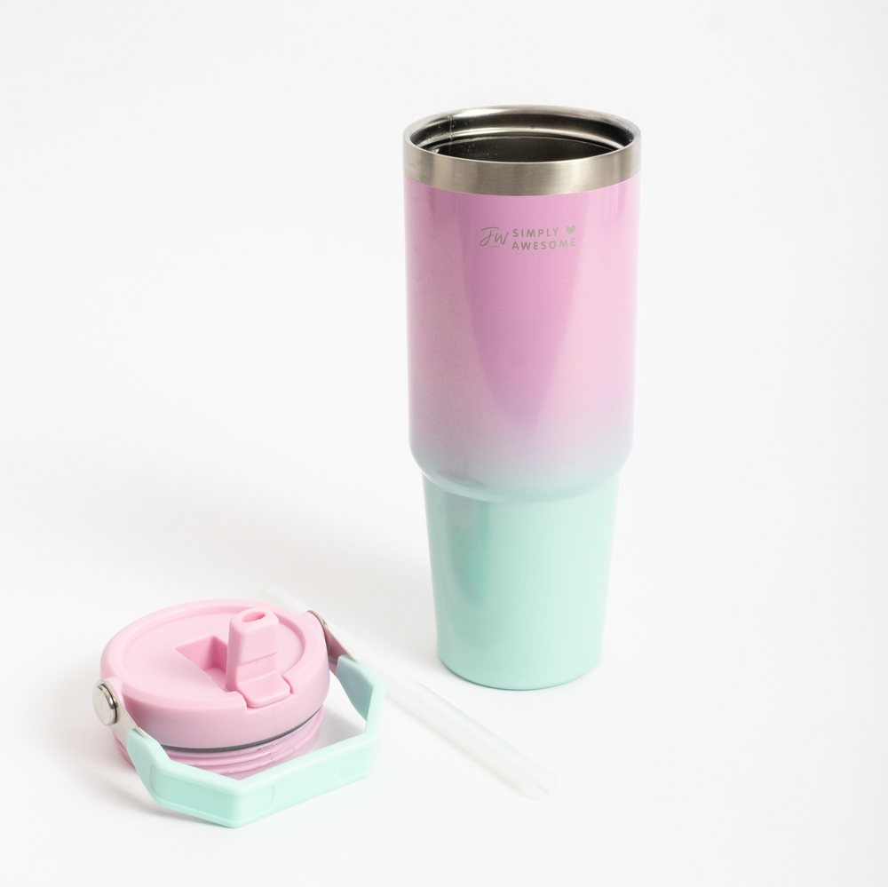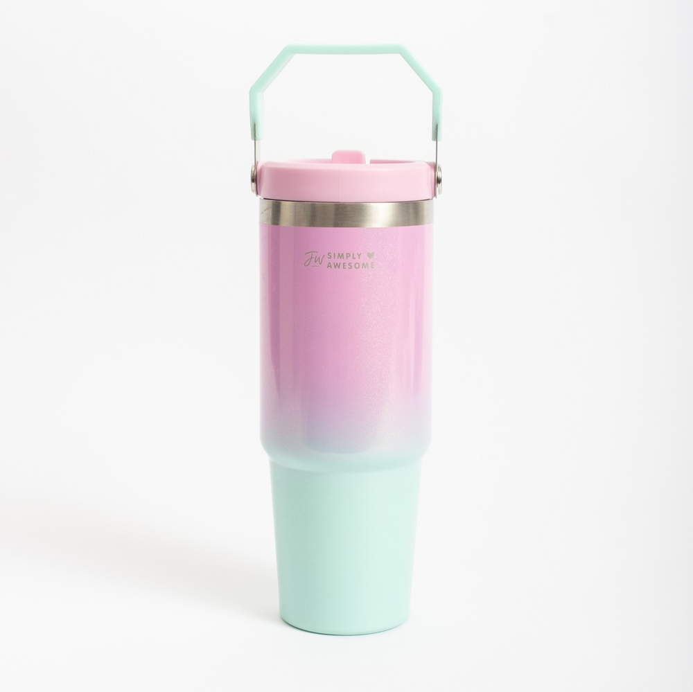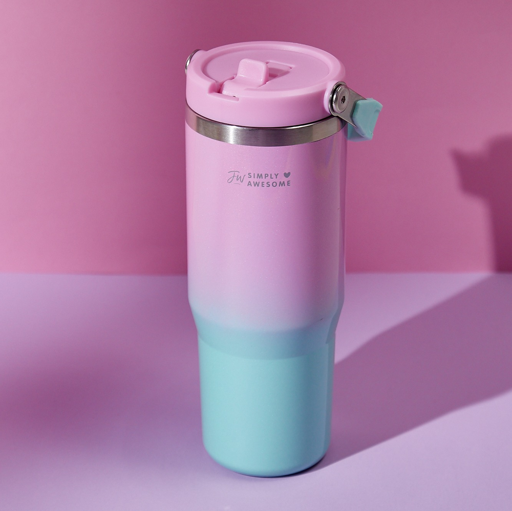 Vaso térmico de 880 ml (30 oz) en acero inoxidable de doble pared, mantiene la temperatura hasta por 12 horas. Libre de BPA. Dos variantes de diseño: rosa degrade naranja y rosa degrade celeste con glitter.