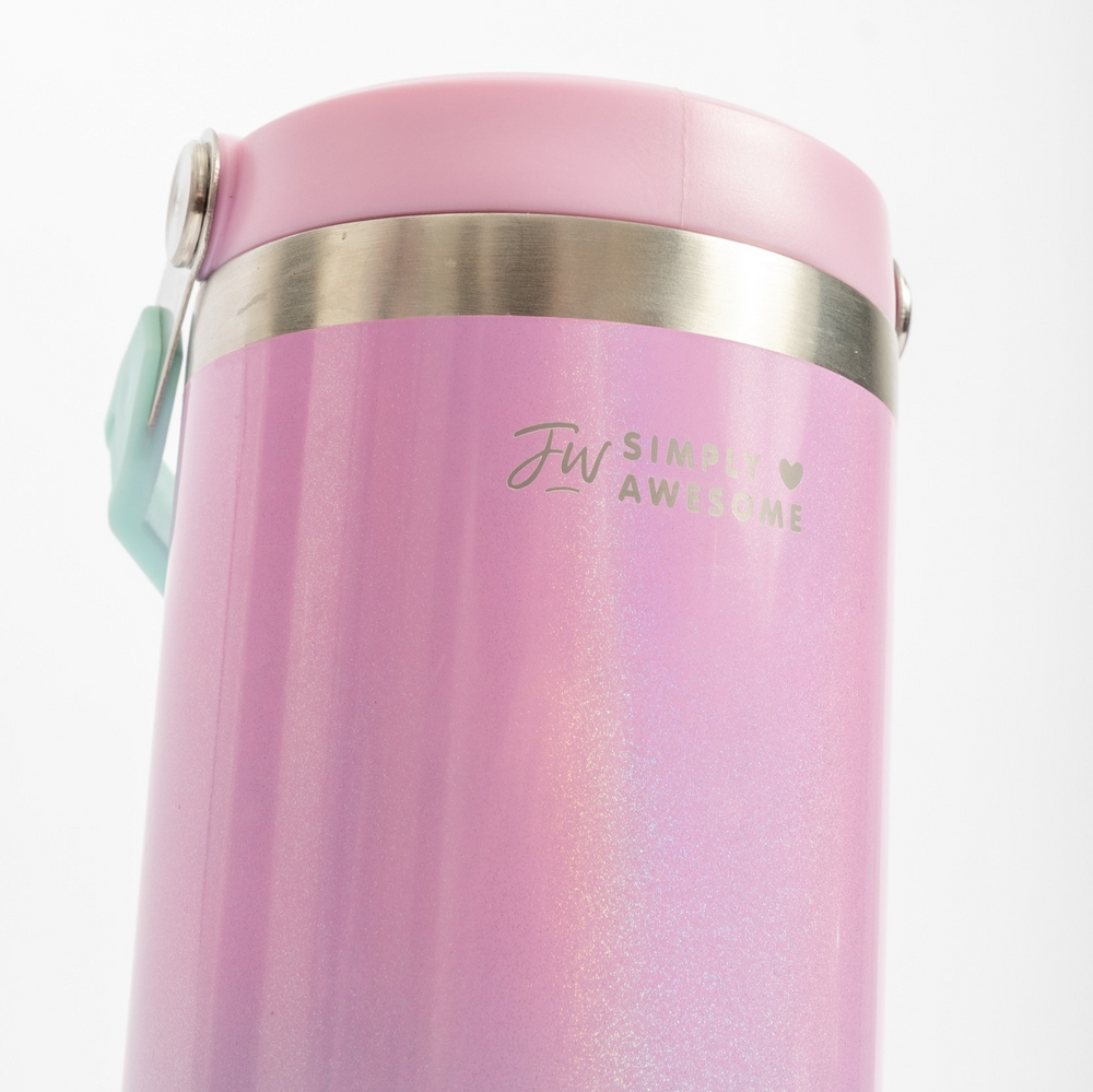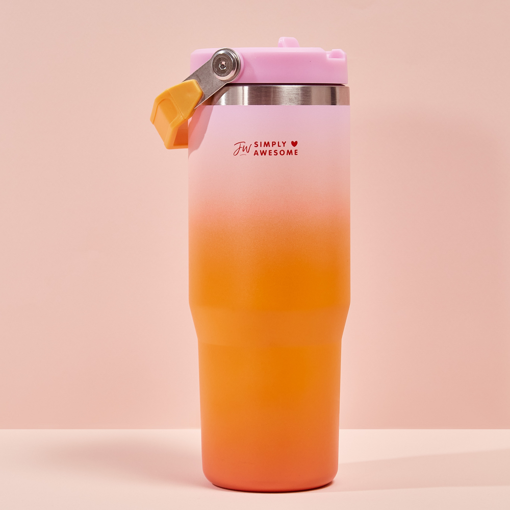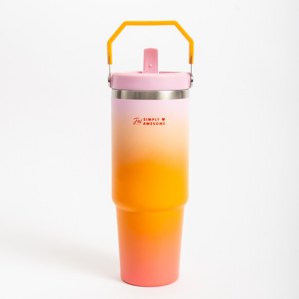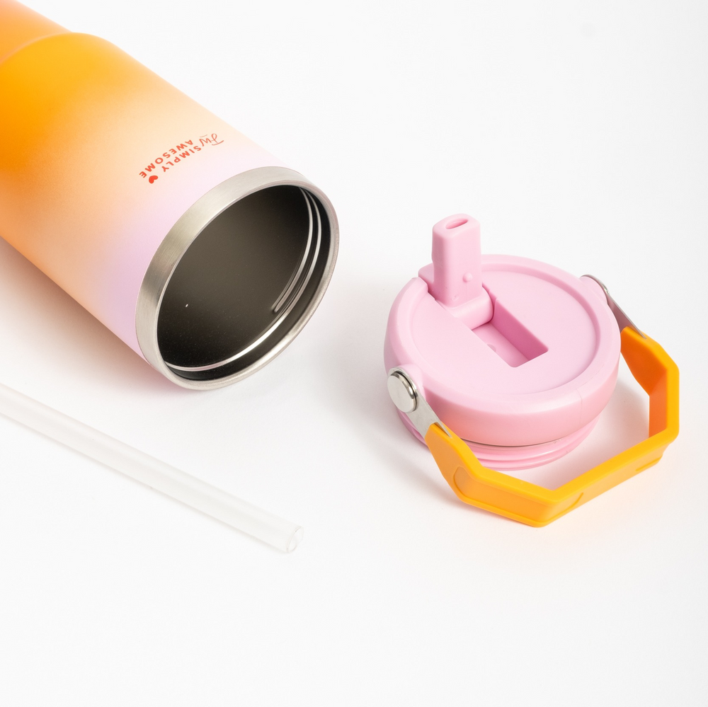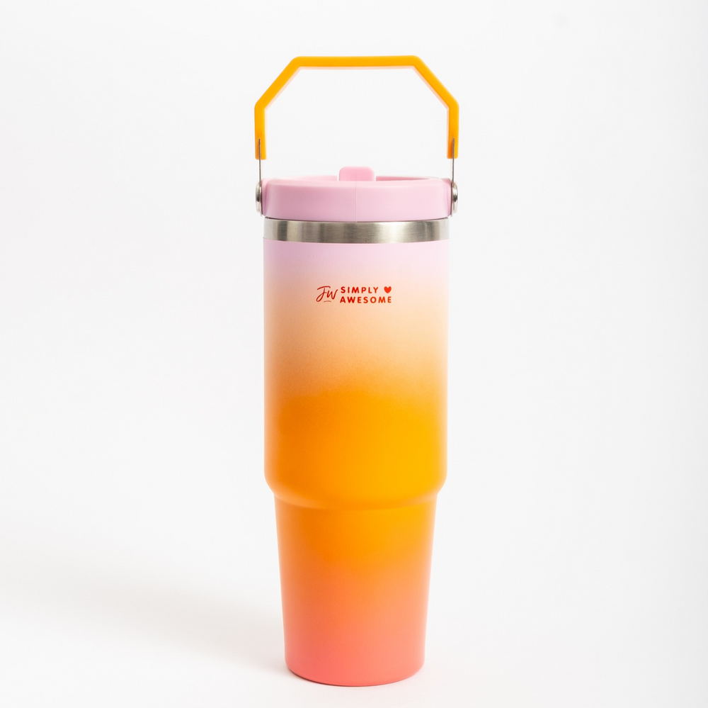 Vaso térmico de 880 ml (30 oz) en acero inoxidable de doble pared, mantiene la temperatura hasta por 12 horas. Libre de BPA. Dos variantes de diseño: rosa degrade naranja y rosa degrade celeste con glitter.
