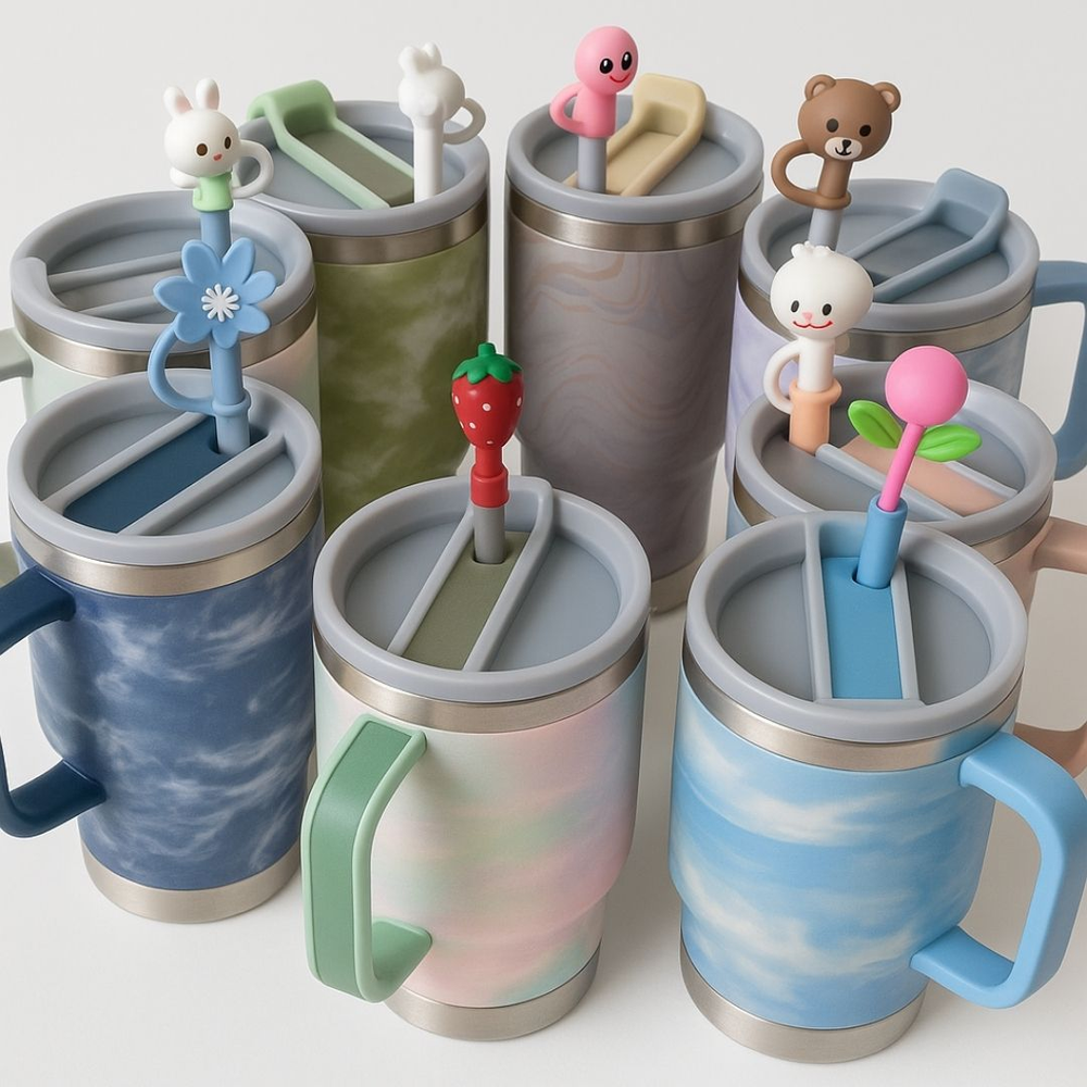 Vaso de acero inoxidable - Manija plastica - Sorbete plastico - Varios Modelos: celeste, lila, azul, multicolor, rosado, violeta, verde.