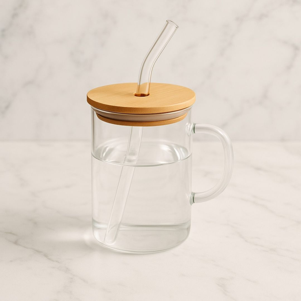 Vaso vidrio con sorbete de vidrio, tapa de bamboo