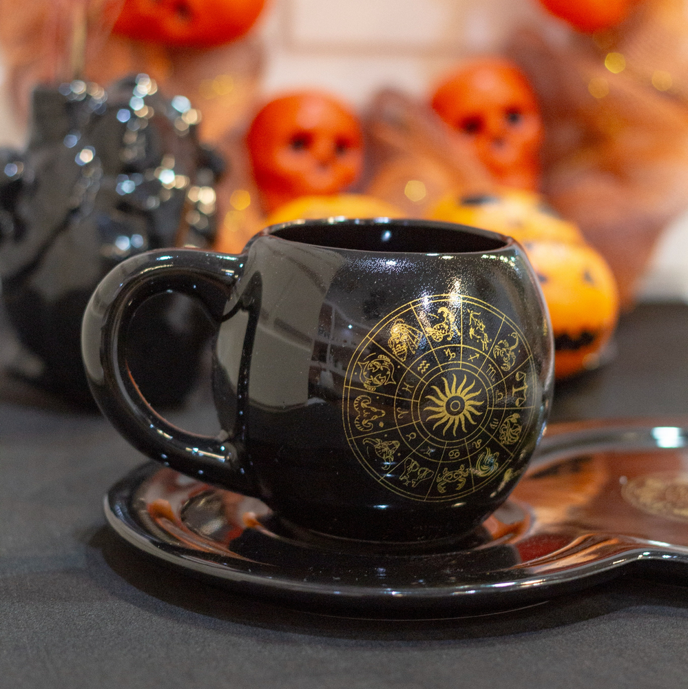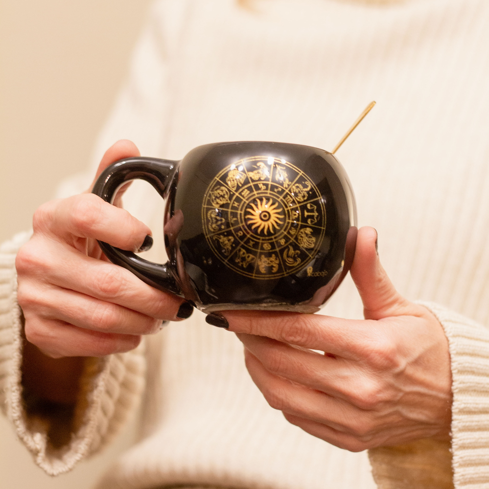 Taza de cerámica con diseño burbuja, de color negro y estampado zodiaco en dorado