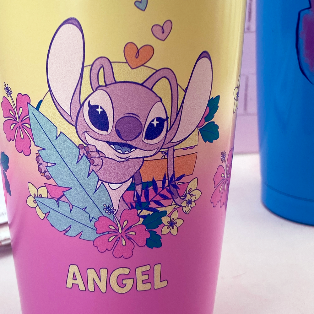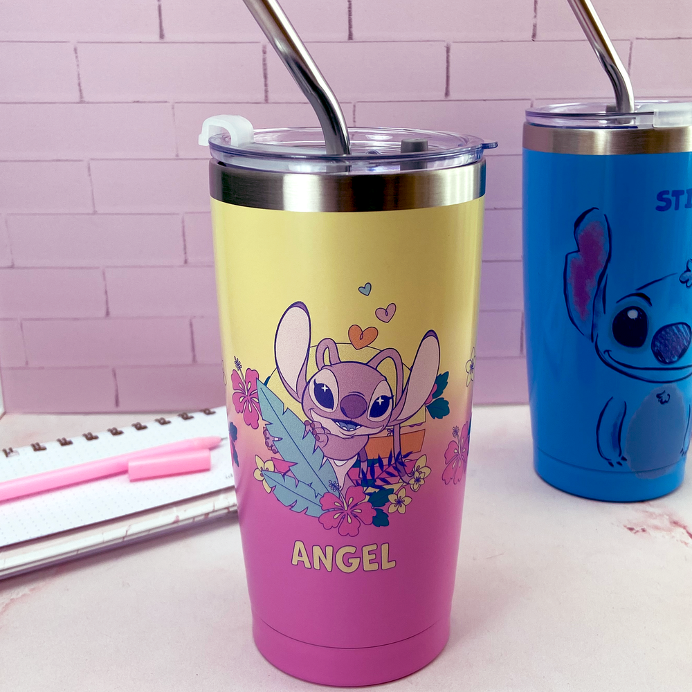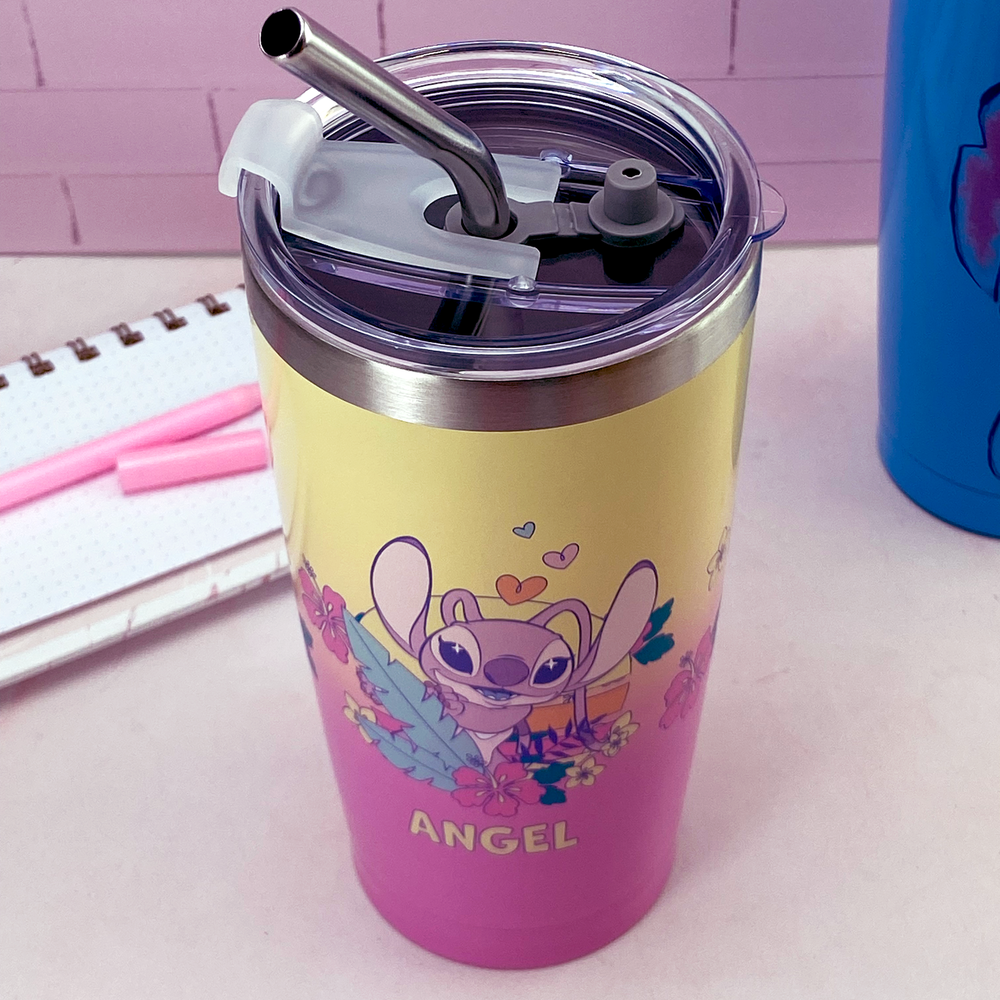 Vaso térmico de acero inoxidable, con tapa transparente y sorbete metálico.