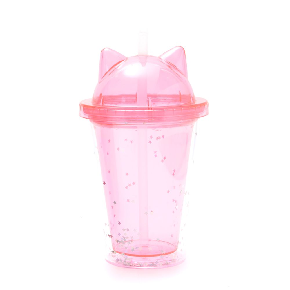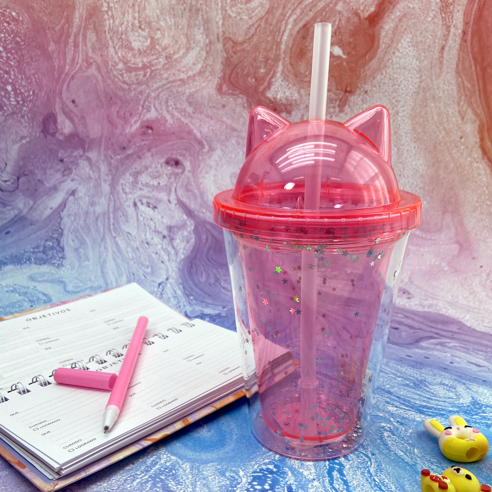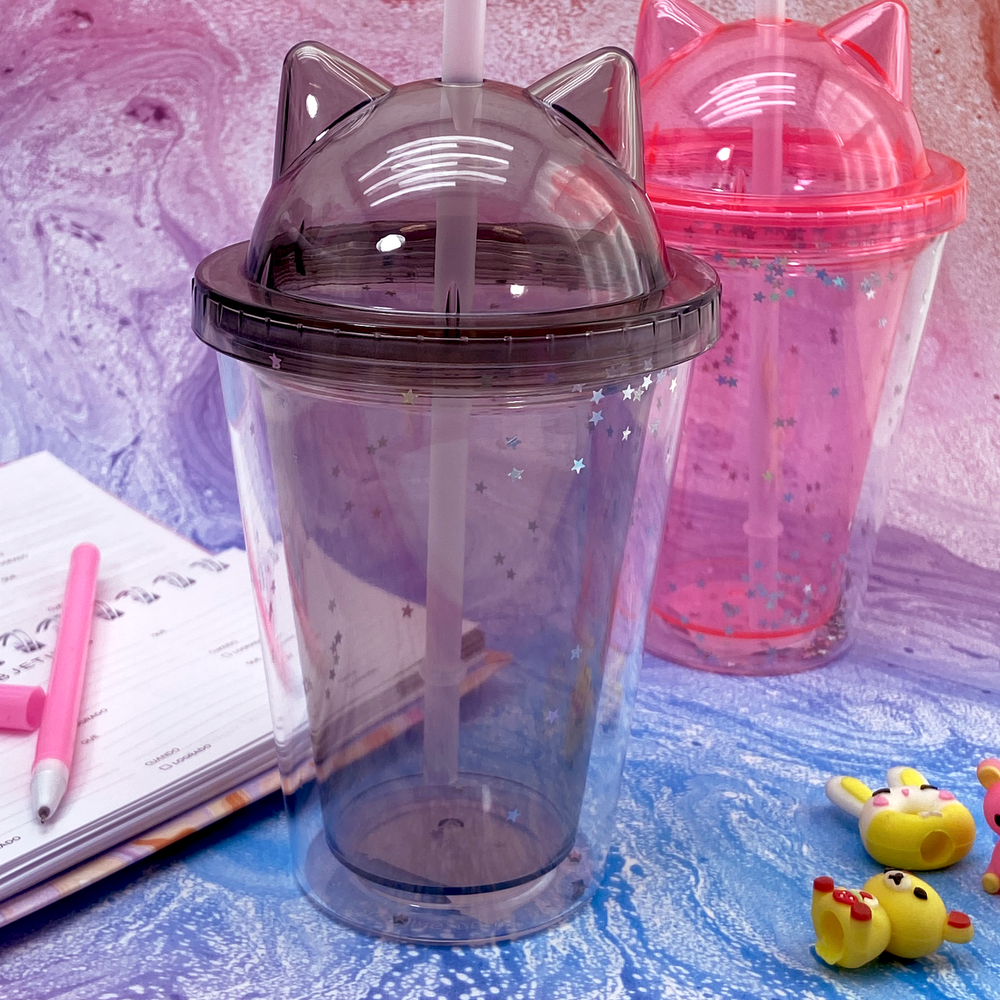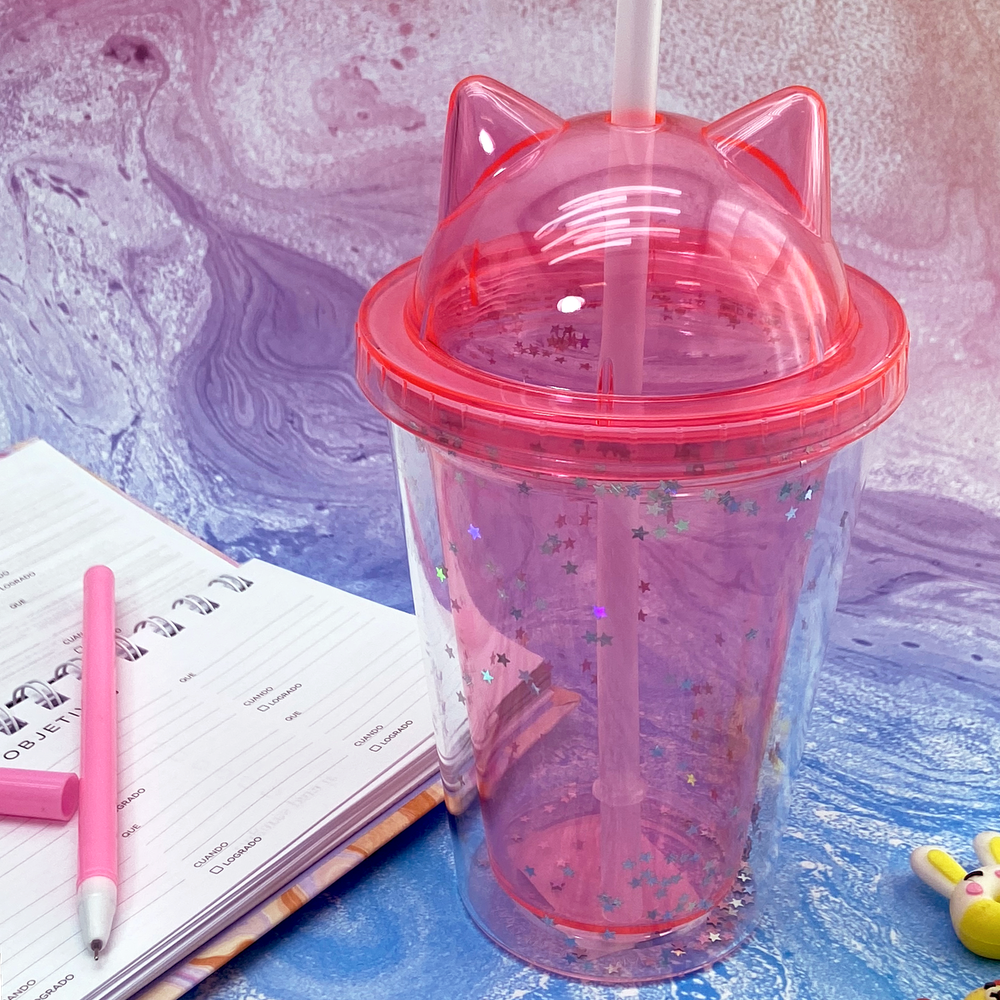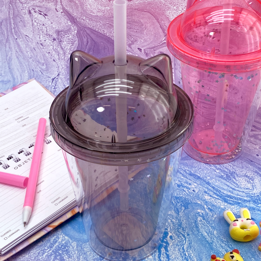 Vaso infantil con tapa con diseño de orejitas de gato y brillitos.