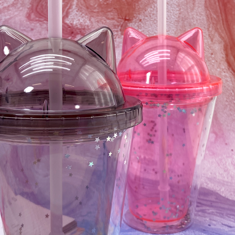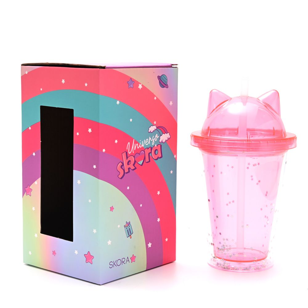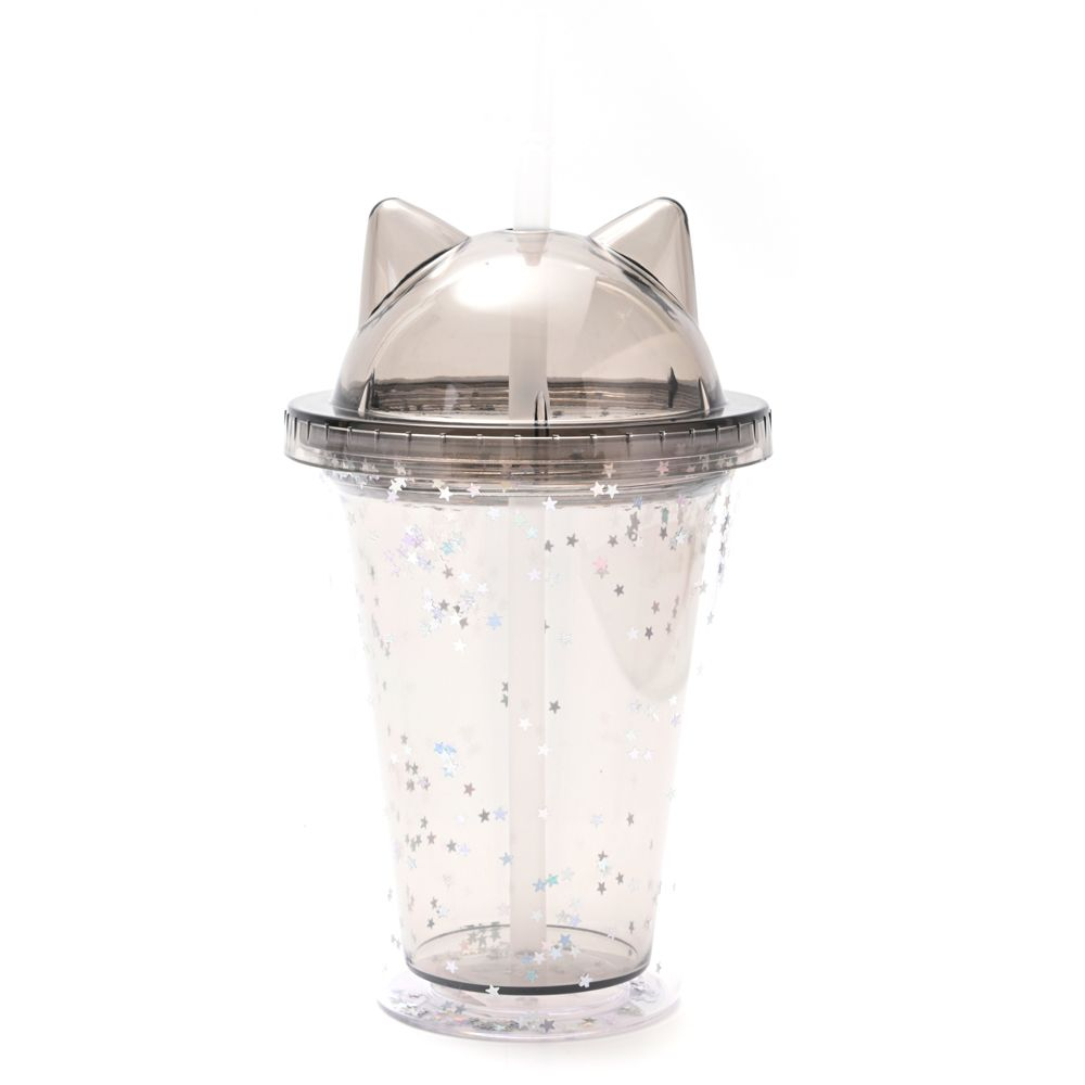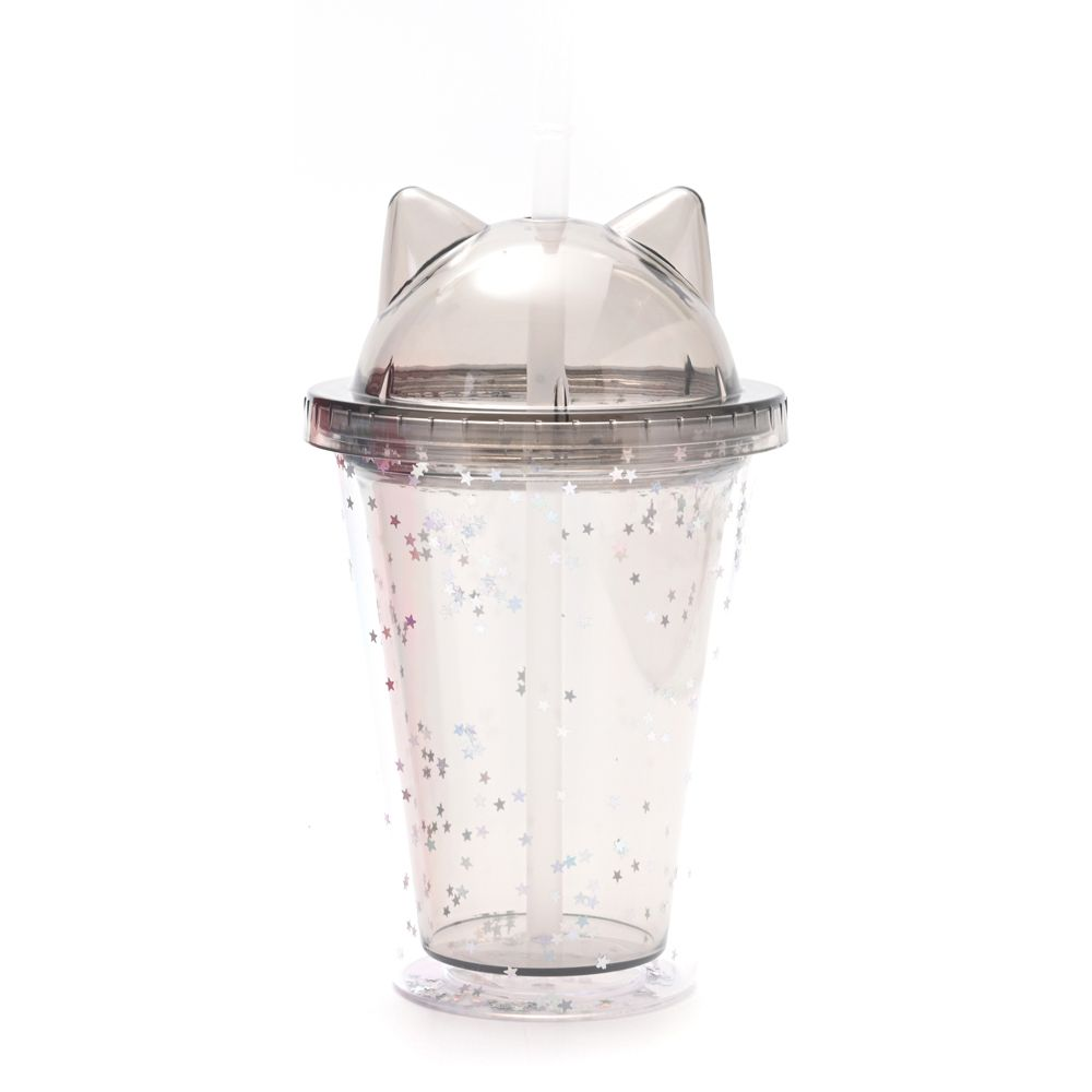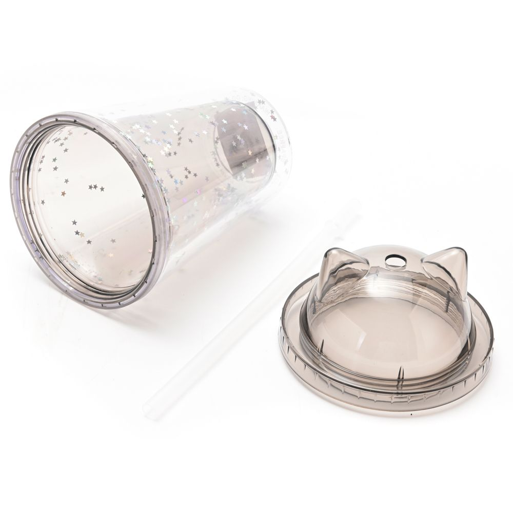 Vaso infantil con tapa con diseño de orejitas de gato y brillitos.