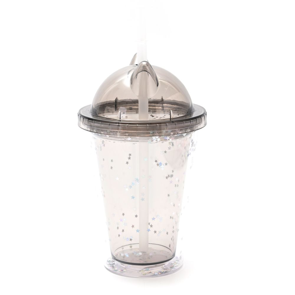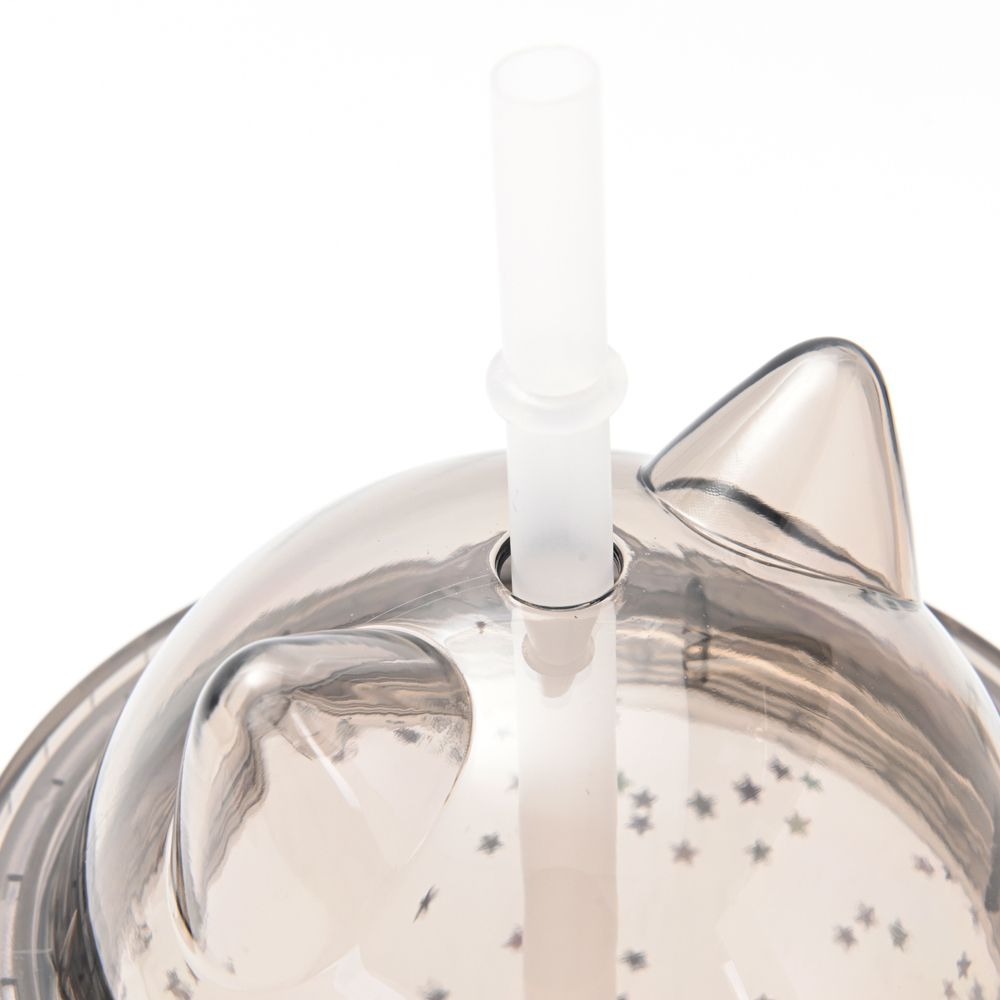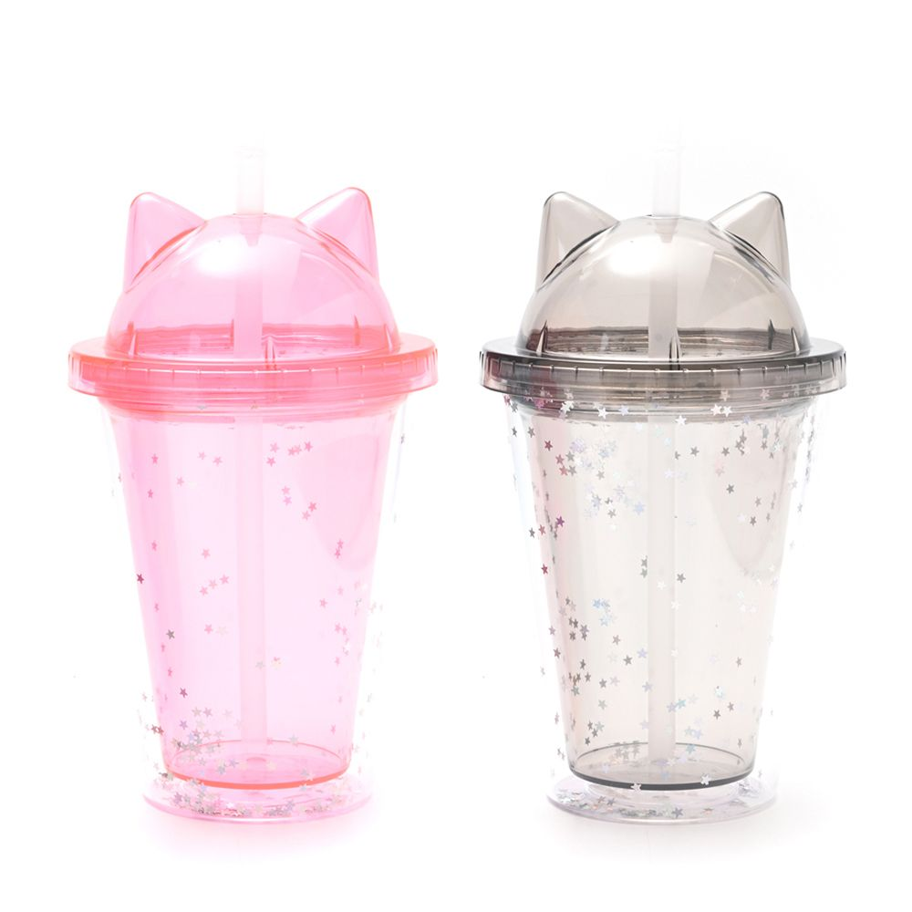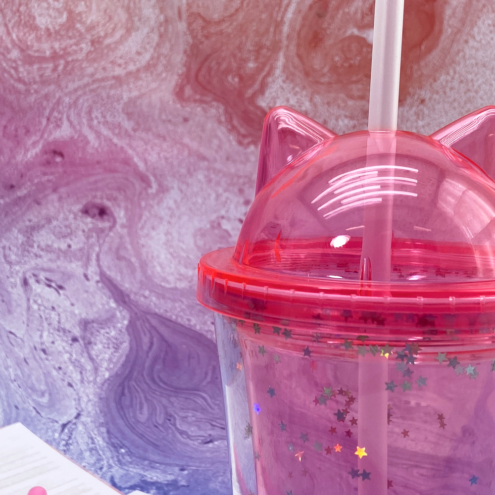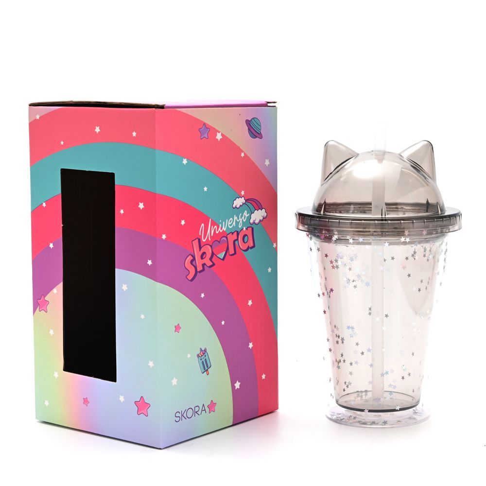 Vaso infantil con tapa con diseño de orejitas de gato y brillitos.