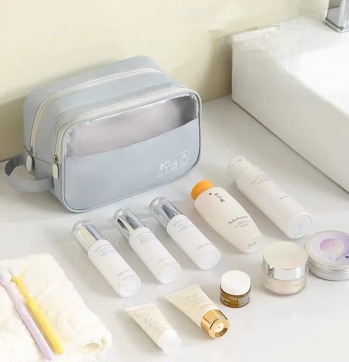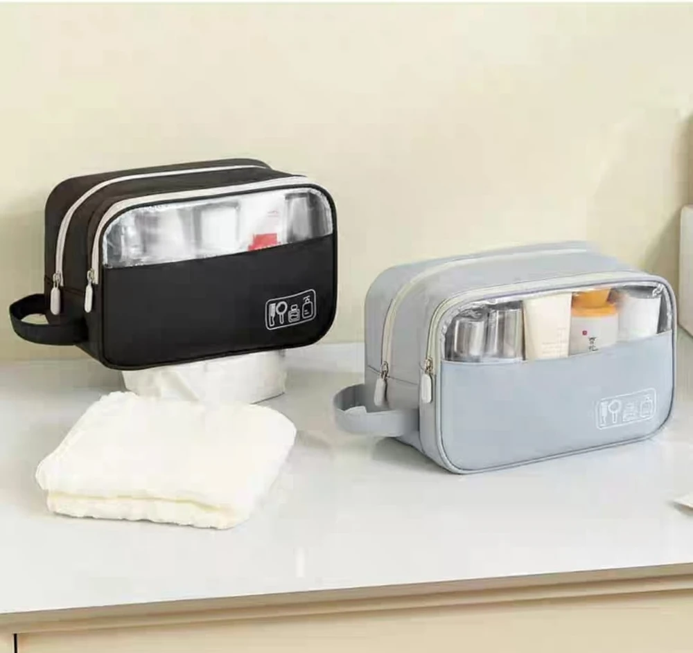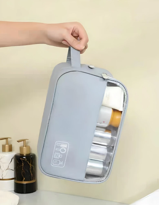 Portacosméticos para organizar y transportar productos de belleza y cuidado personal como maquillaje, cremas, y artículos de tocador. Mantiene los productos protegidos de derrames y la humedad, gracias a su material impermeable. Facilita la visualización del contenido debido a su diseño semitransparente