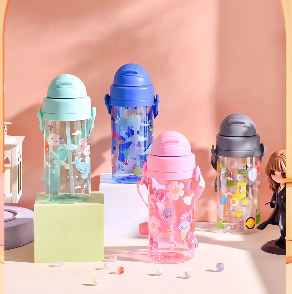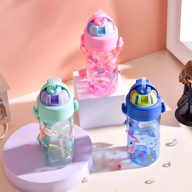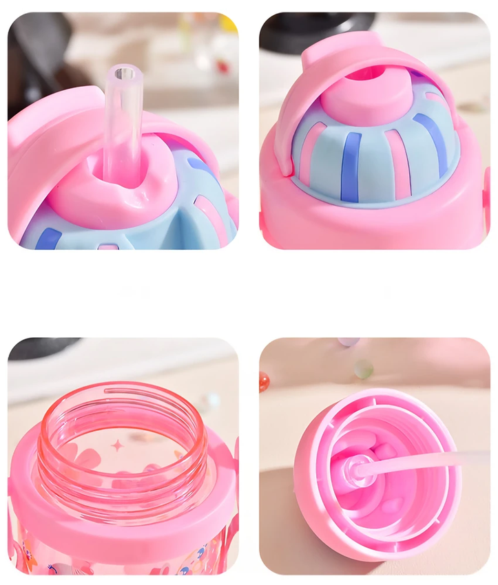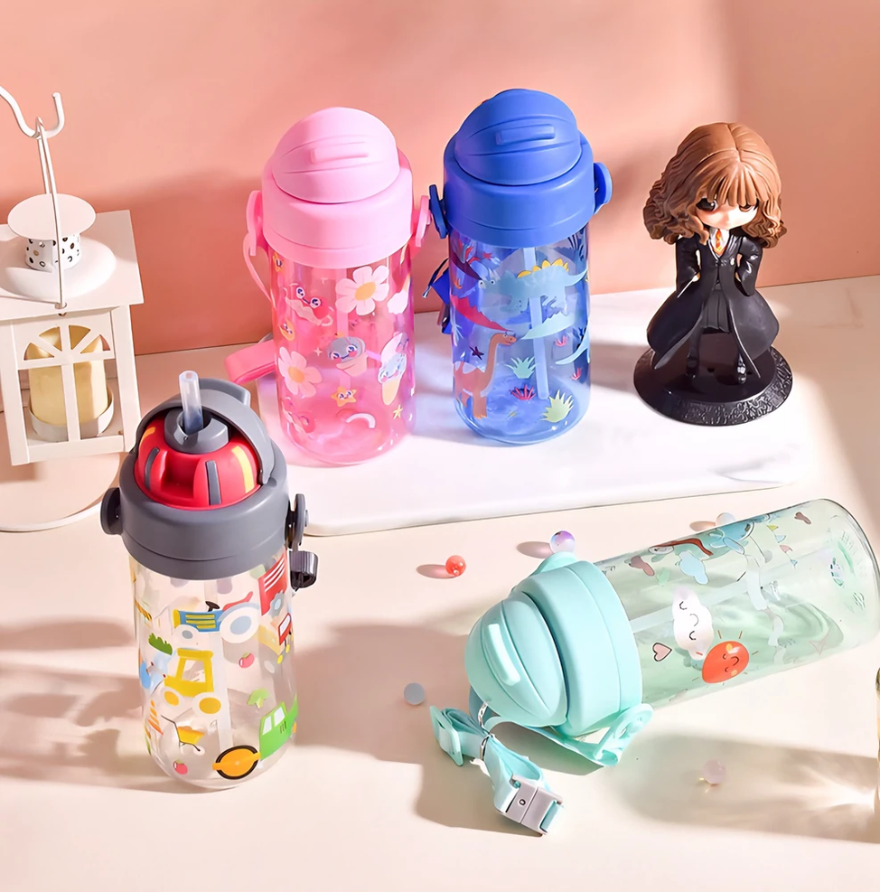 Botella animada para niños, niñas y adultos. Son cómodas y fáciles de transportar. Cuenta con tapa a rosca, pico de succión y una correa