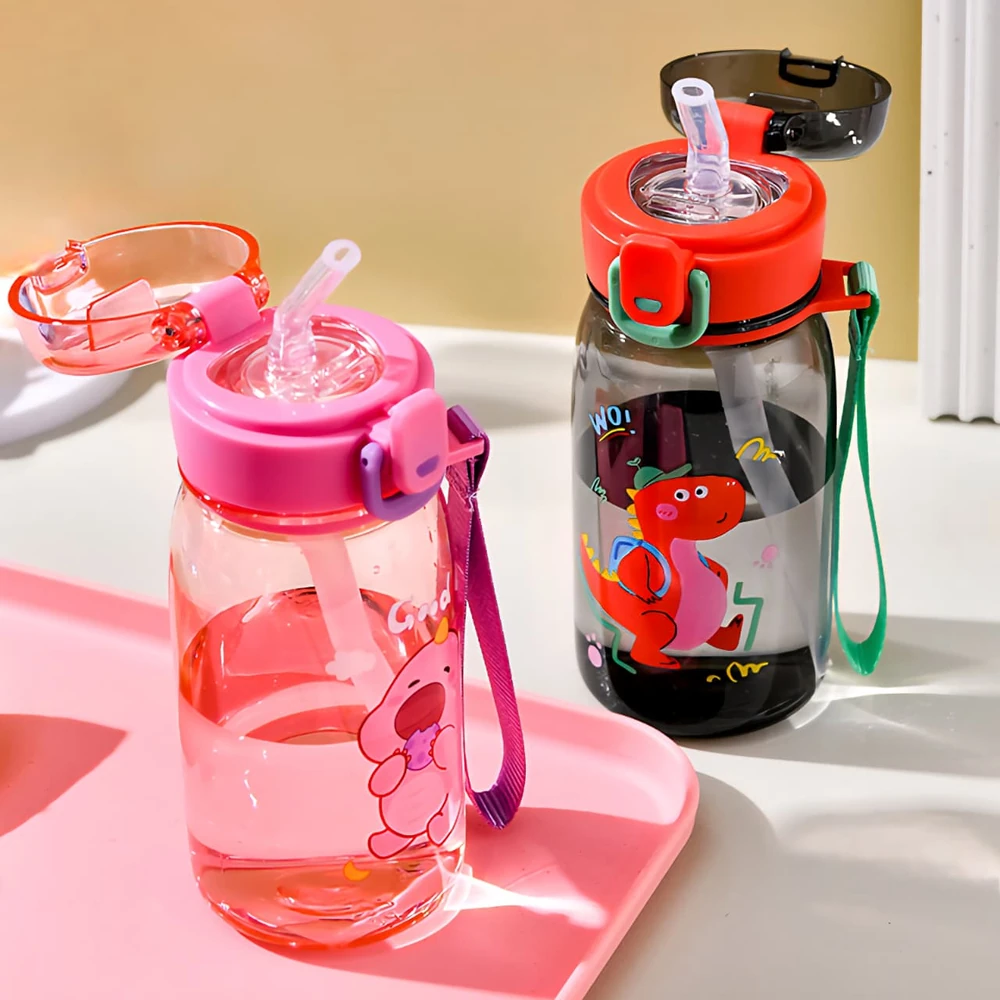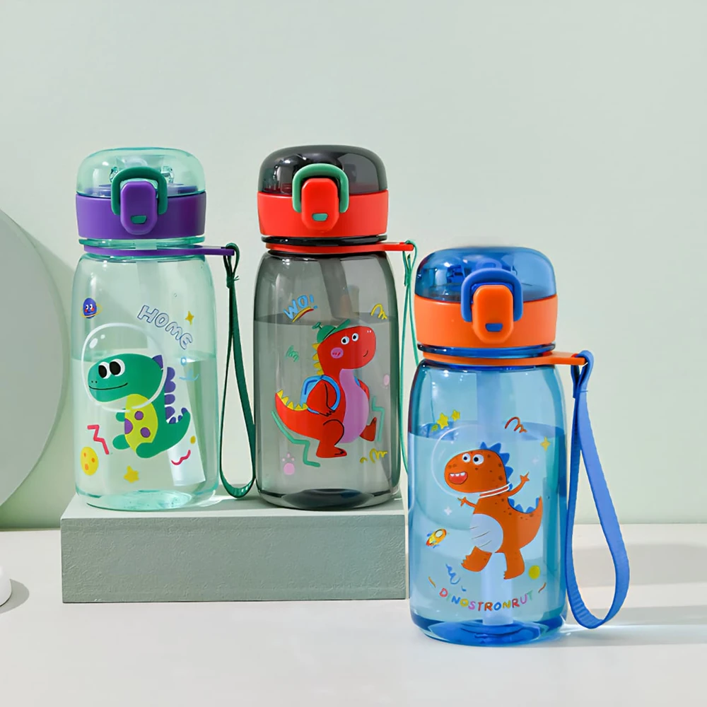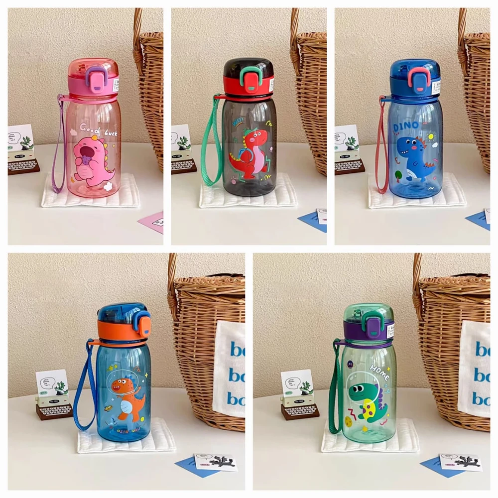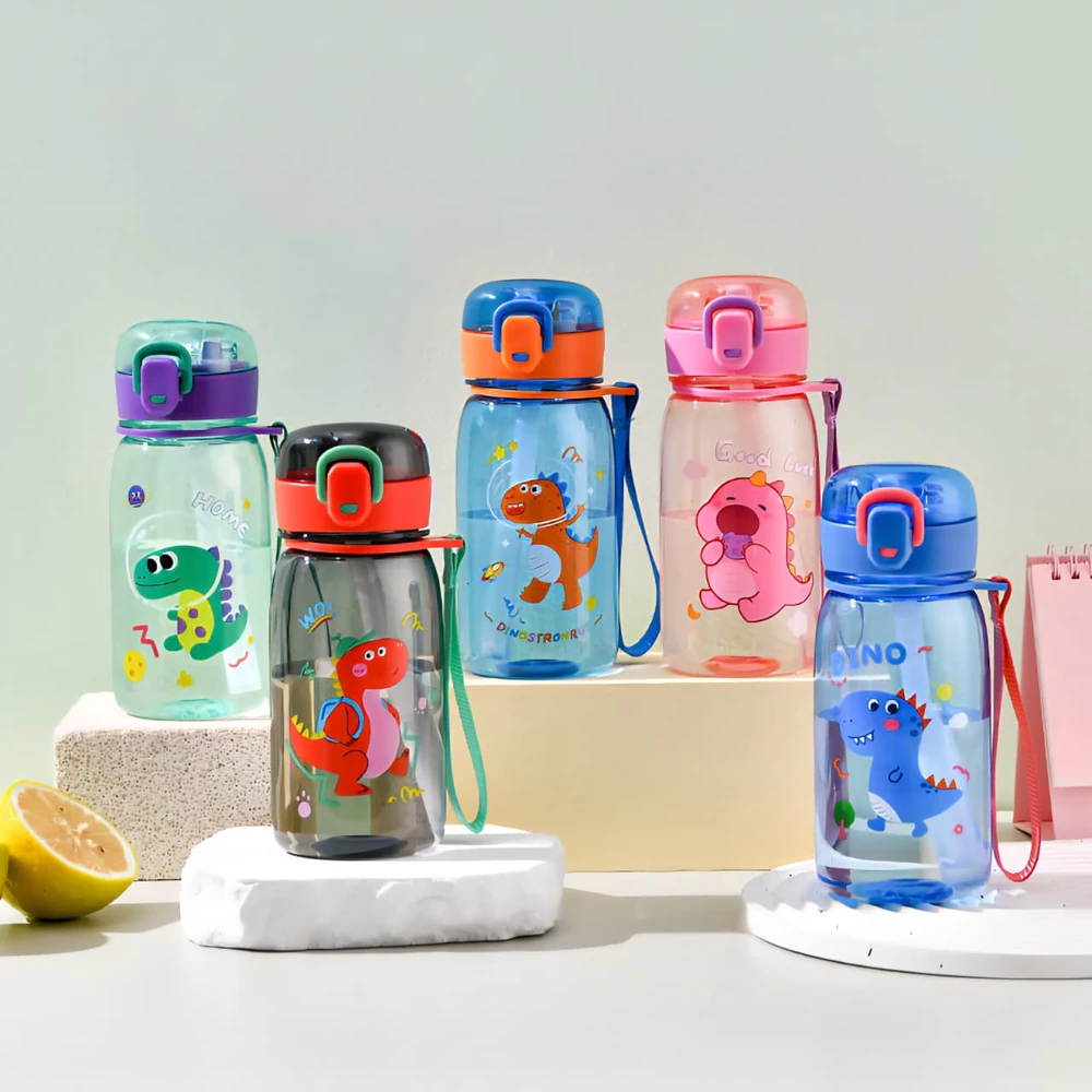 Botellas de agua infantiles con diseños de dinosaurios en varios colores y estilos, lo que las hace atractivas para los niños. Están hechas de plástico resistente y seguro, también son ideales para mantener a los niños hidratados durante el día. Incluyen picos de succión con sorbete y tapa a rosca para evitar derrames y facilitar su uso