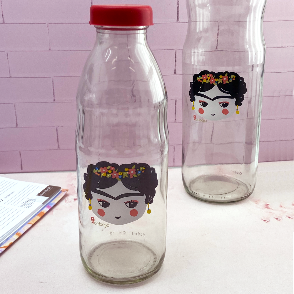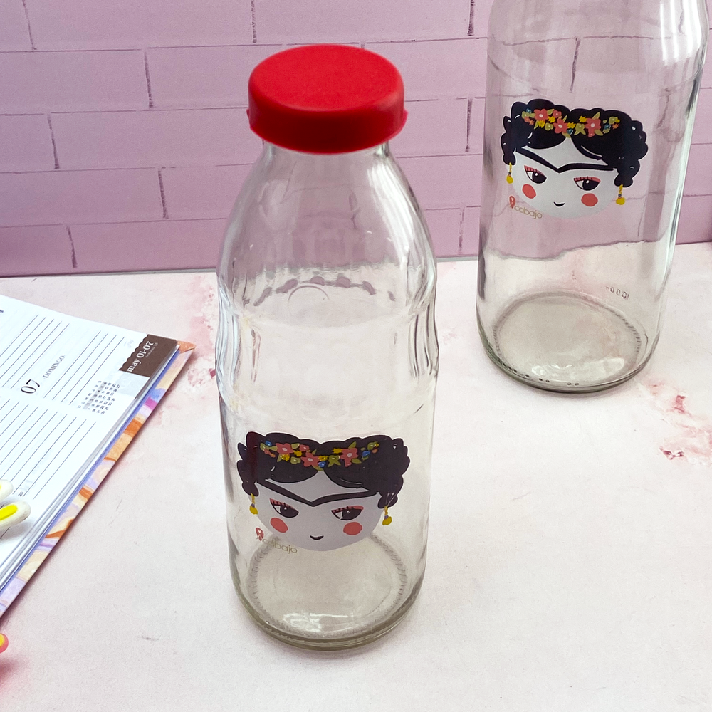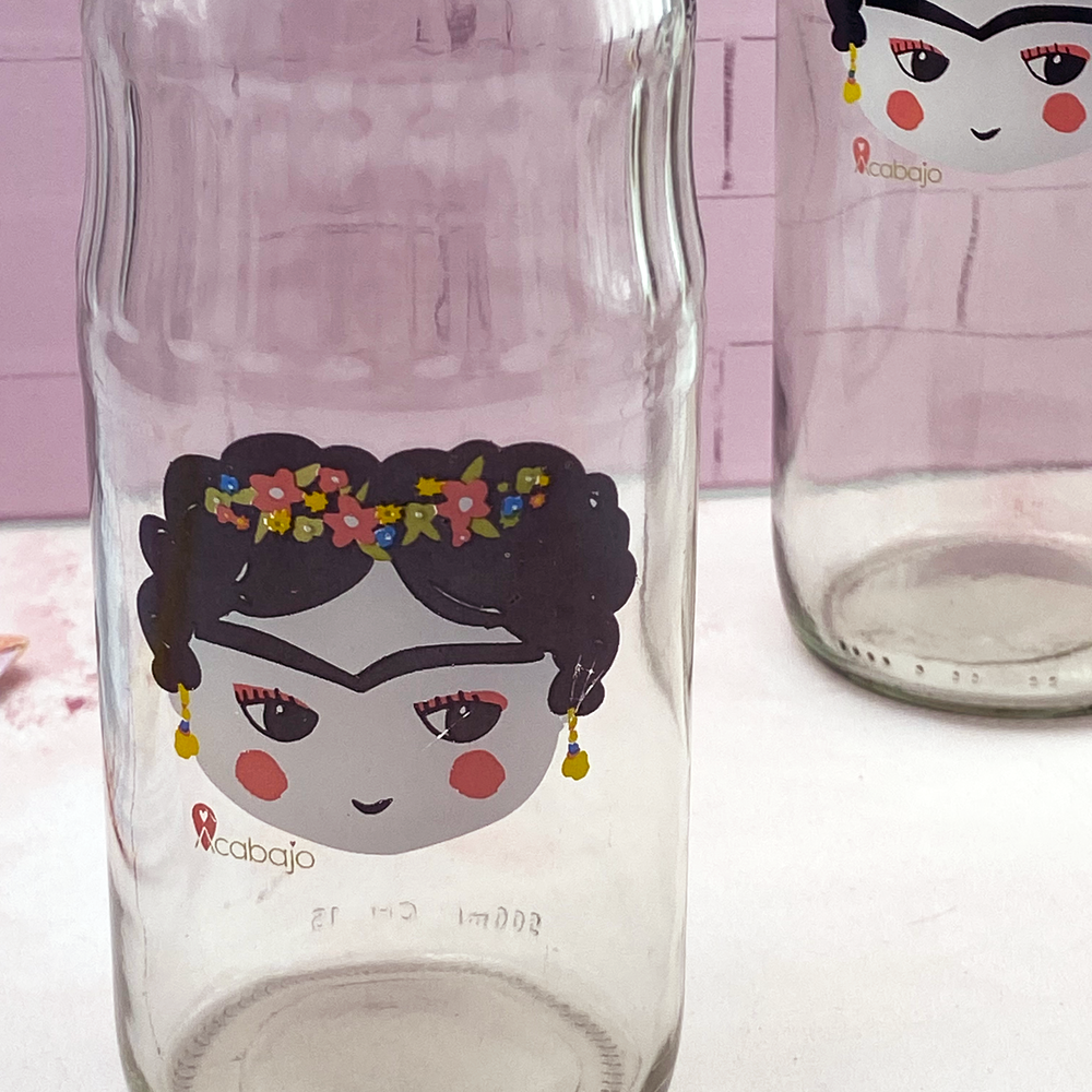 Botella de vidrio de 500ml, con diseño de Frida Kahlo