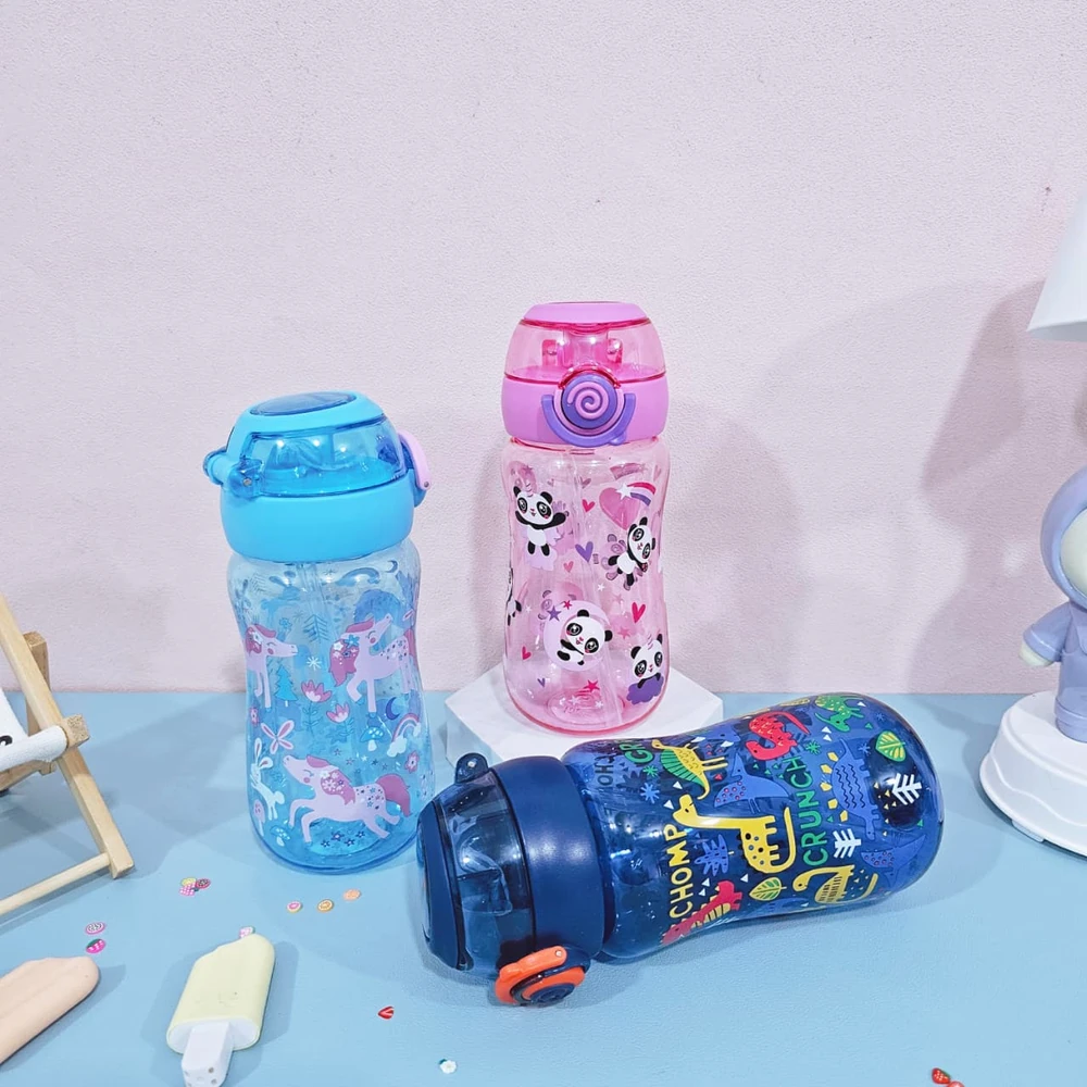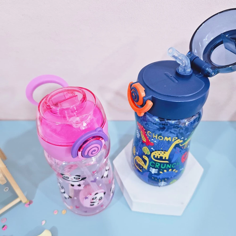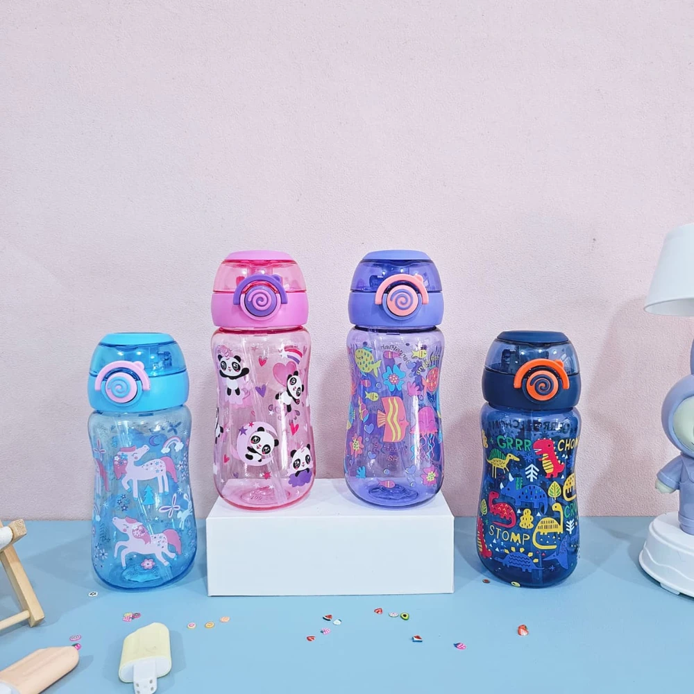 Botella plástica con diseño animado infantil, con tapa y sorbete de silicona