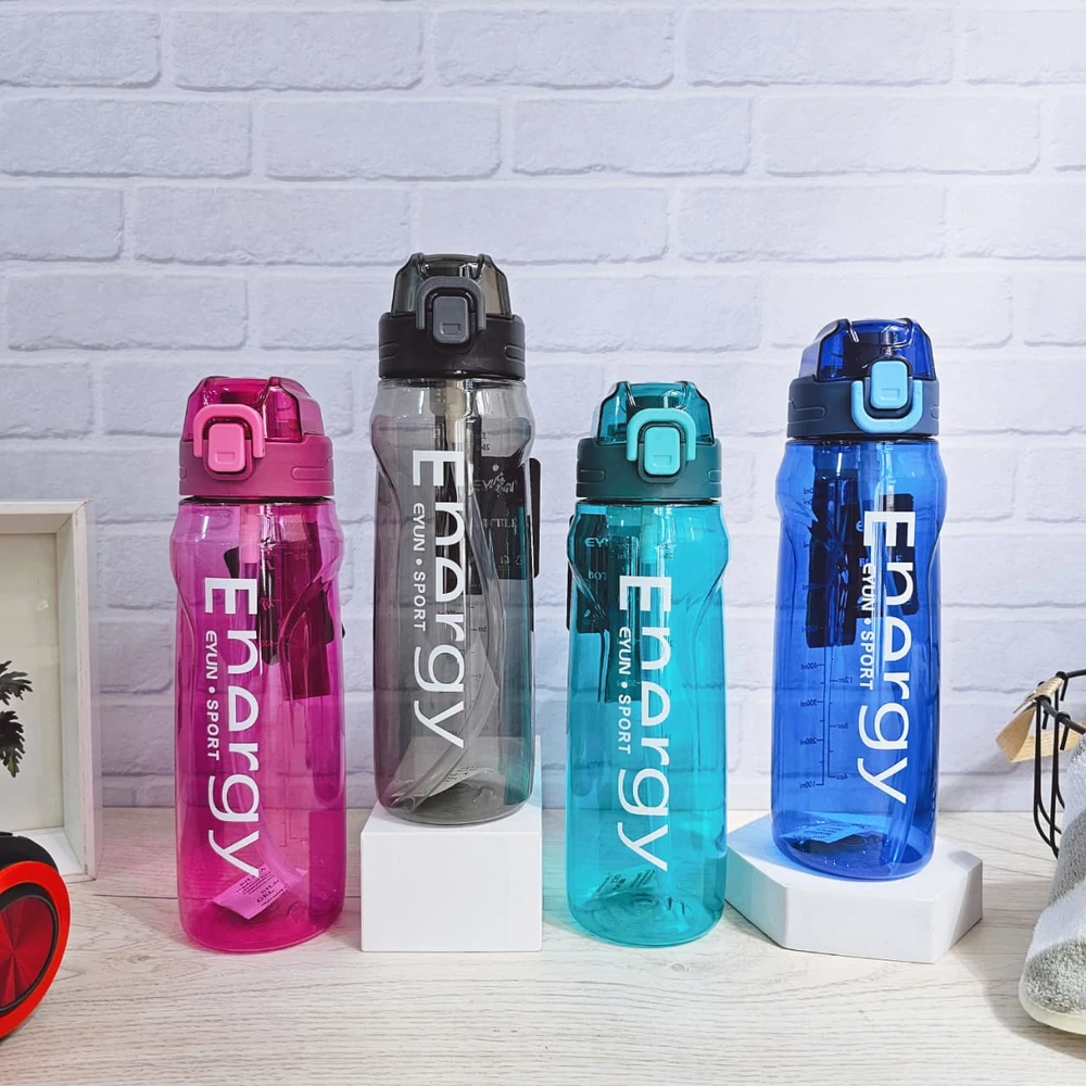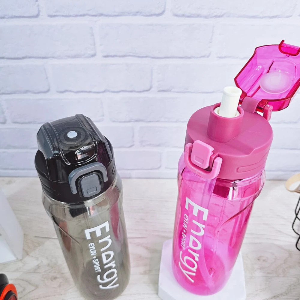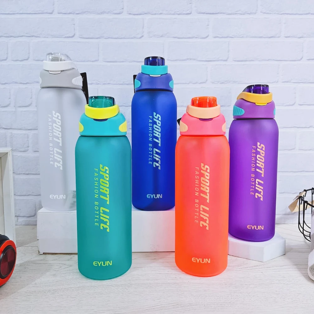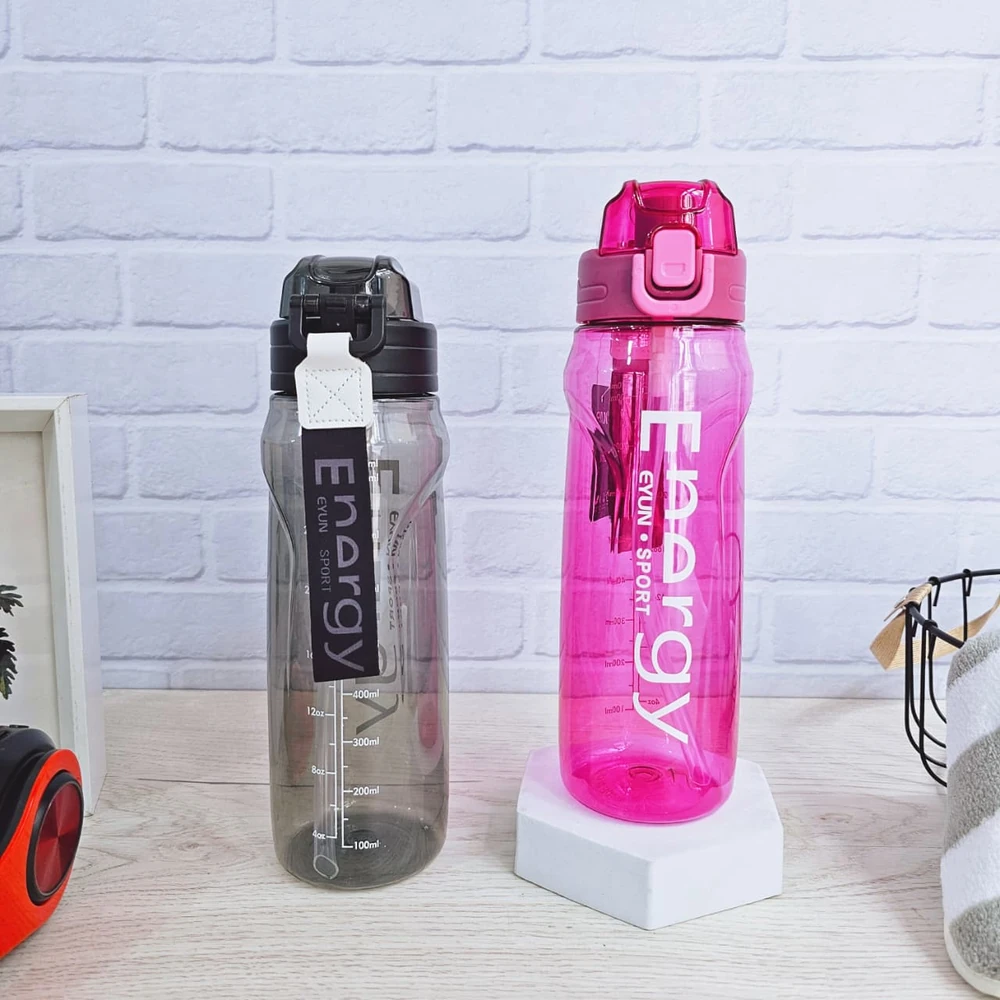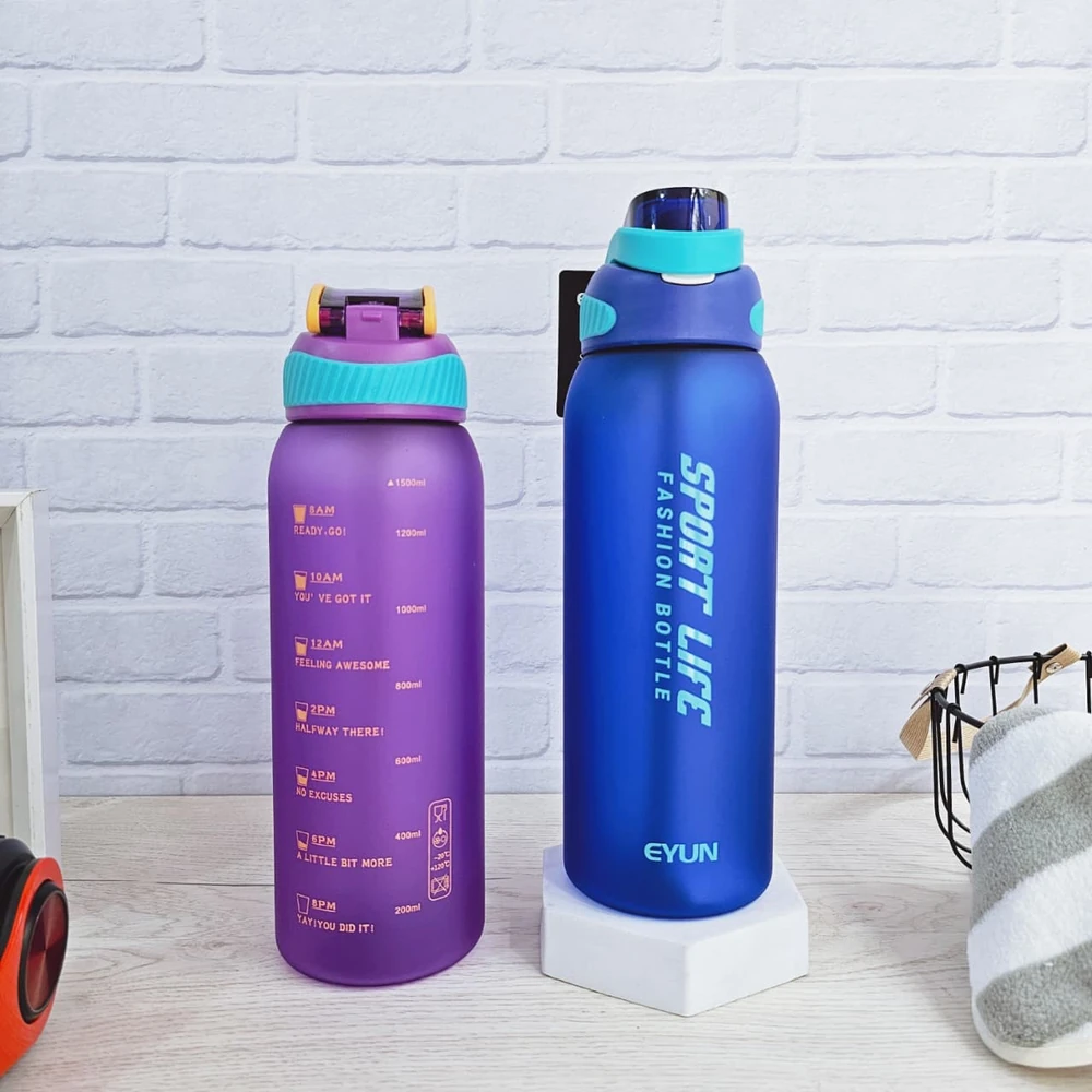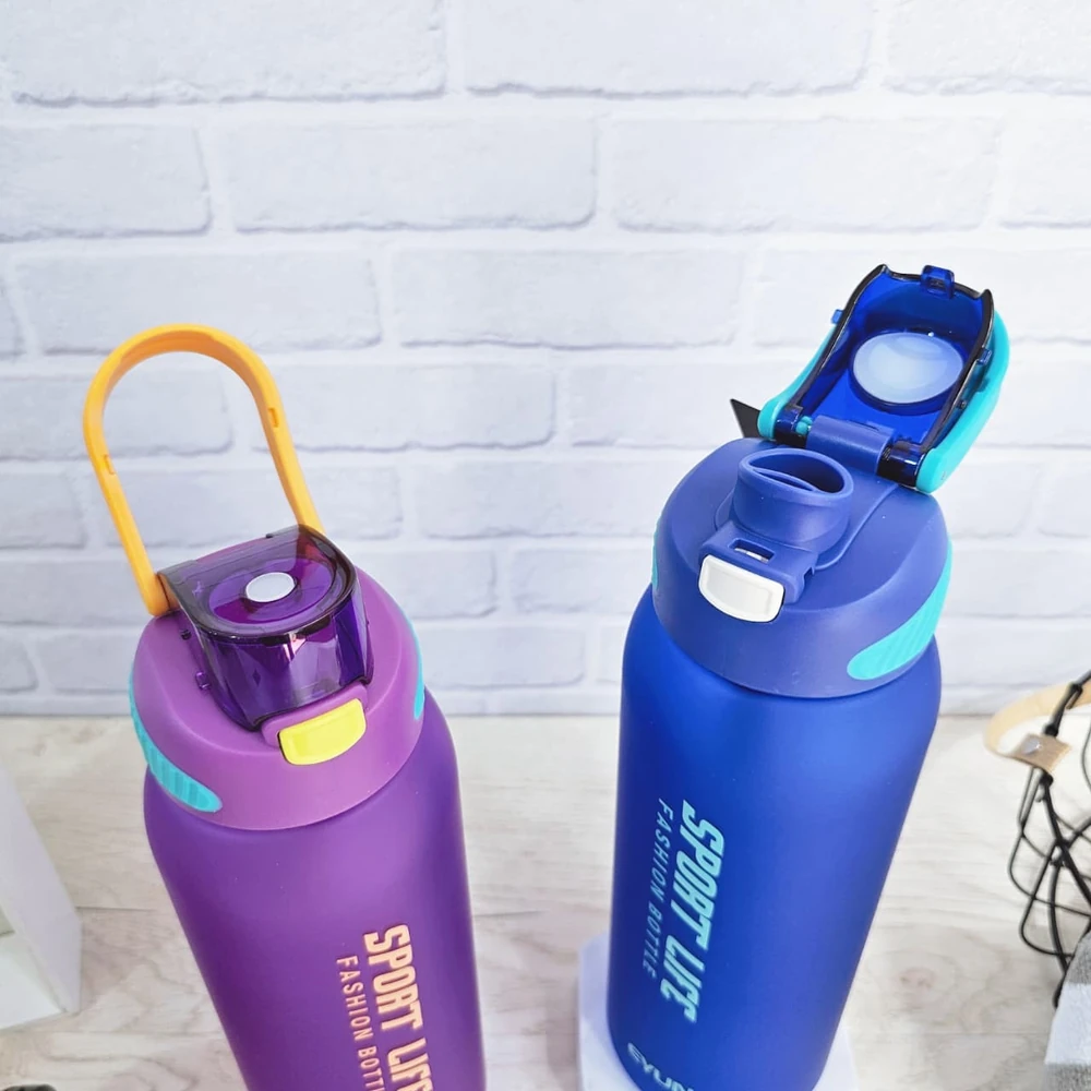Botella plástica en color liso transparente, con tapa y doble pico Con agarre y medición de ml