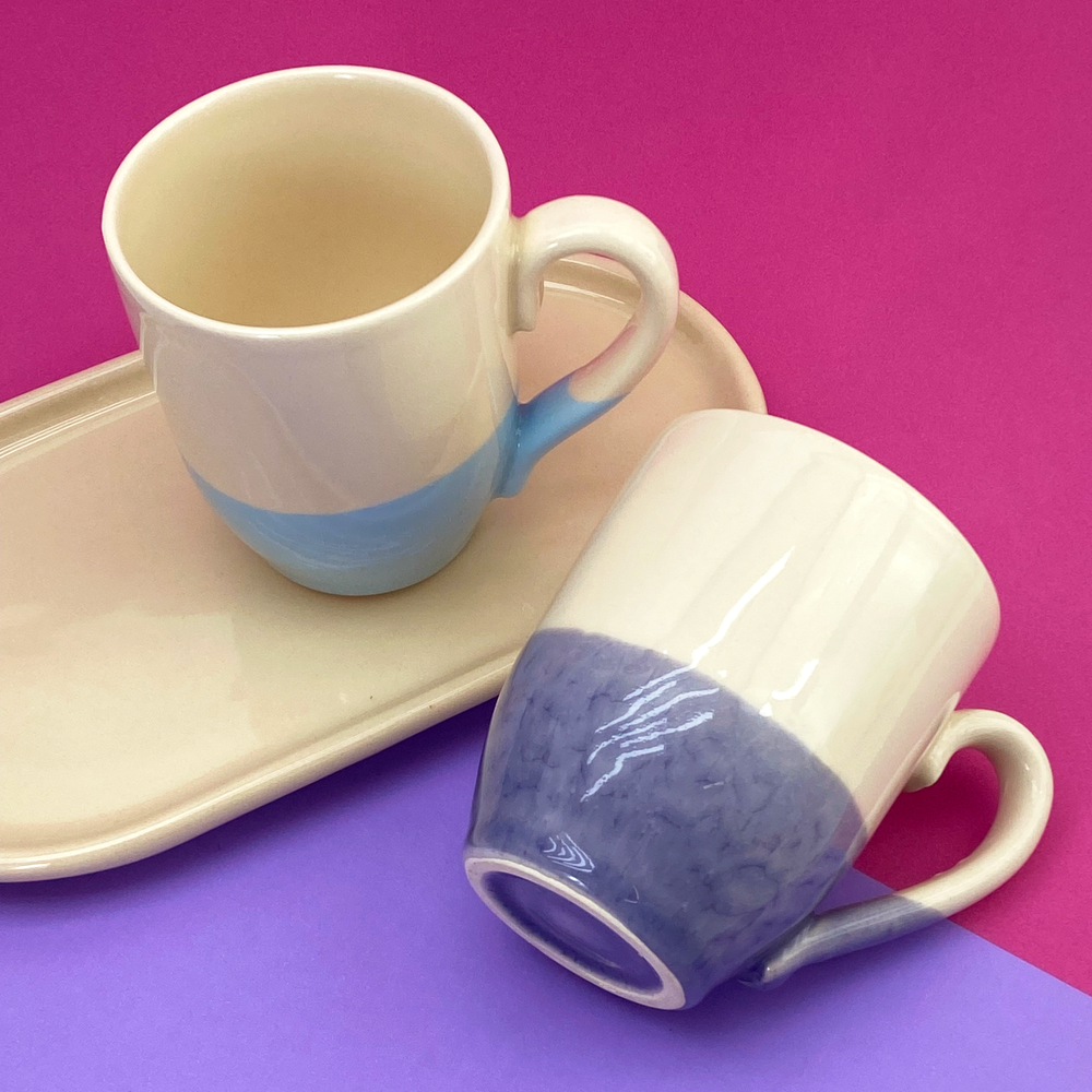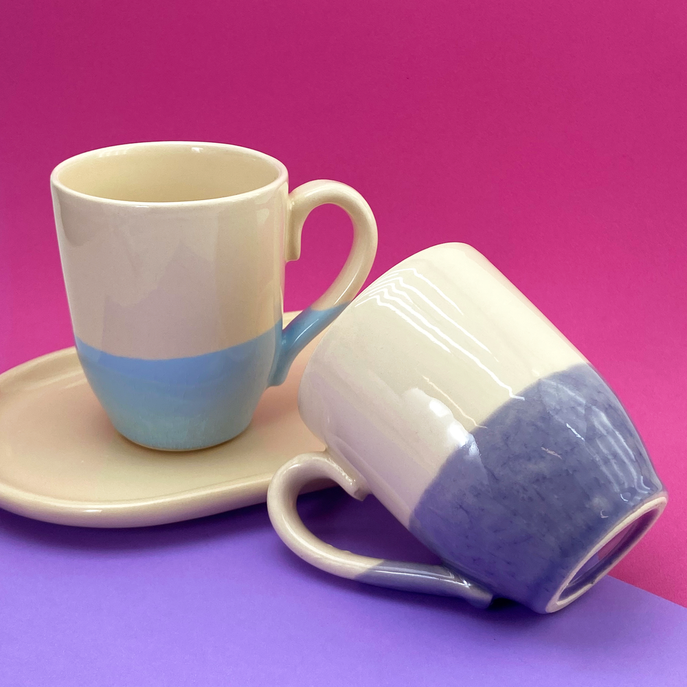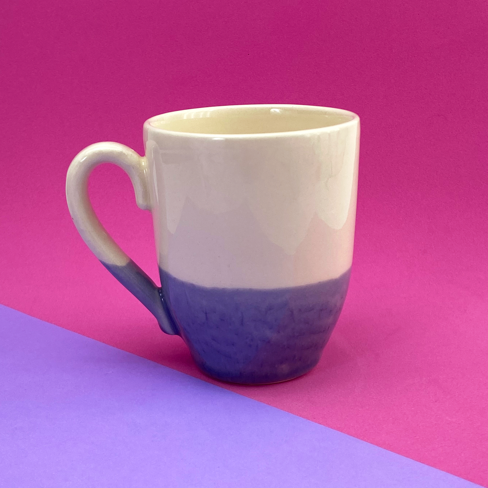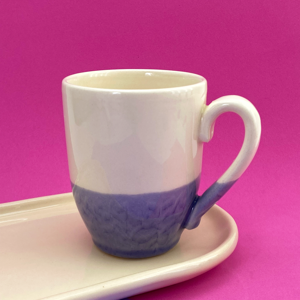 Taza bombé mitad color beige, mitad color lila y celeste
