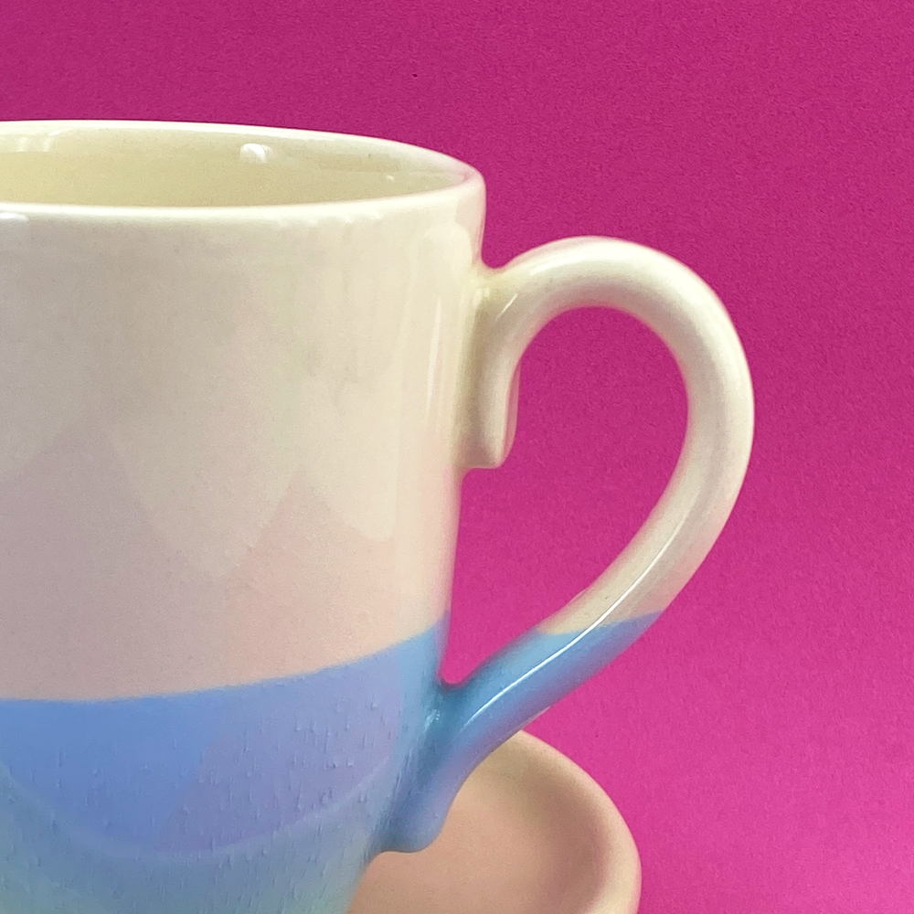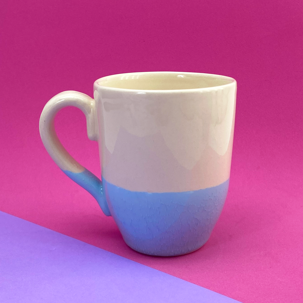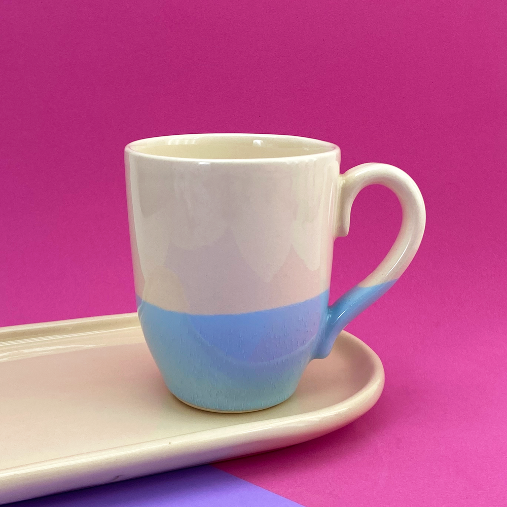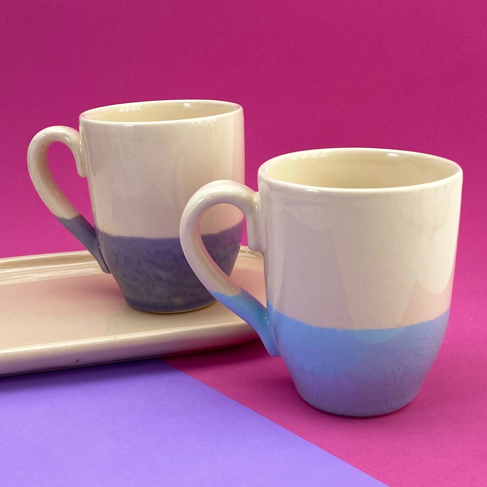 Taza bombé mitad color beige, mitad color lila y celeste