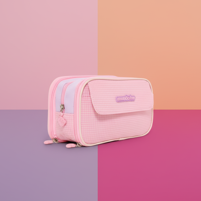 1 compartimento principal grande, 2 bolsillos laterales con 24 elásticos cada uno, 1 bolsillo frontal con tapa (cierre con abrojo).