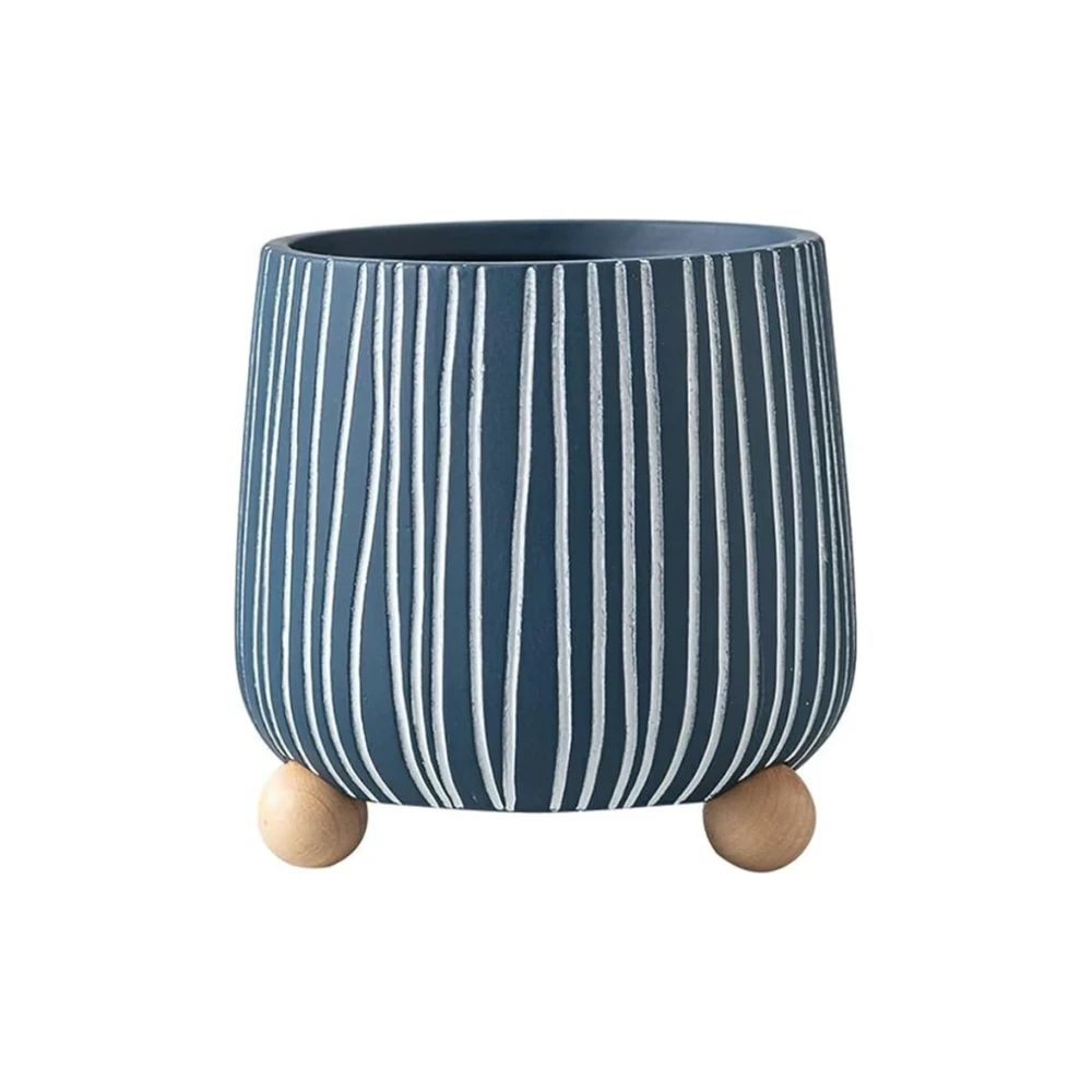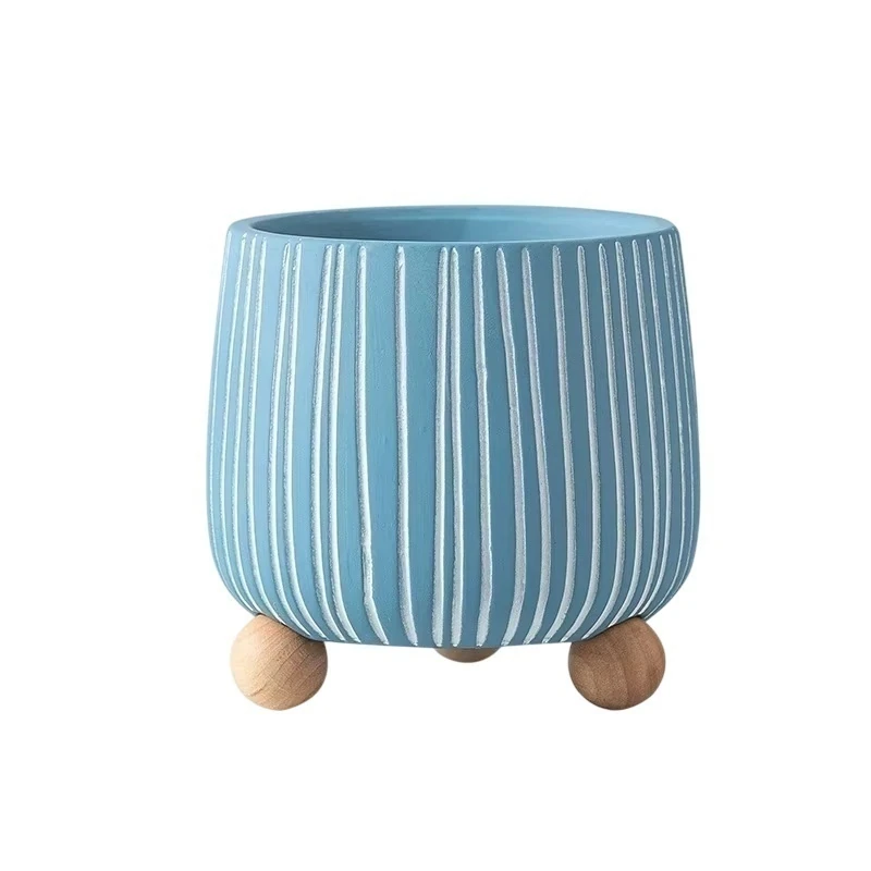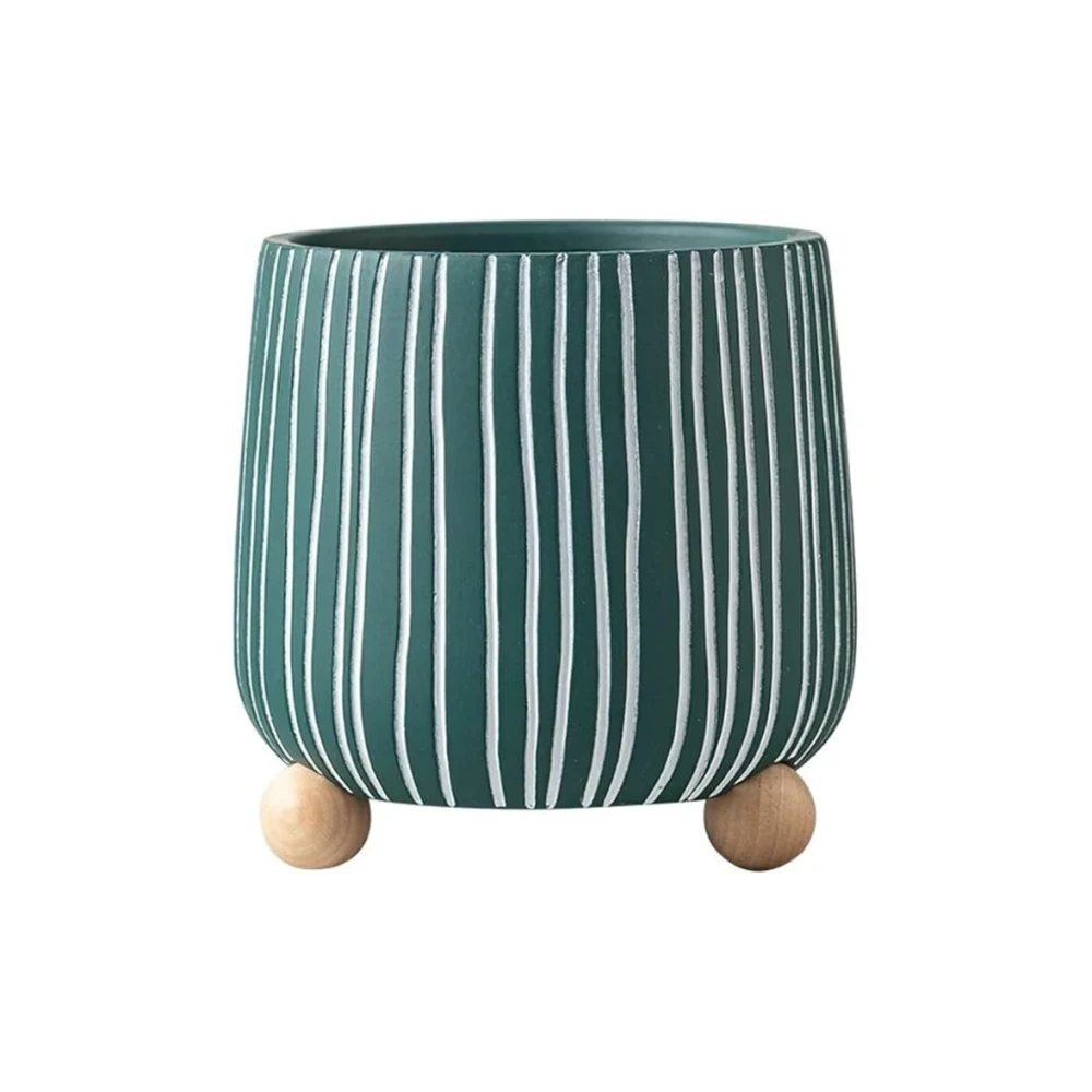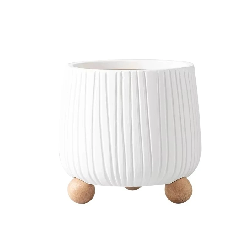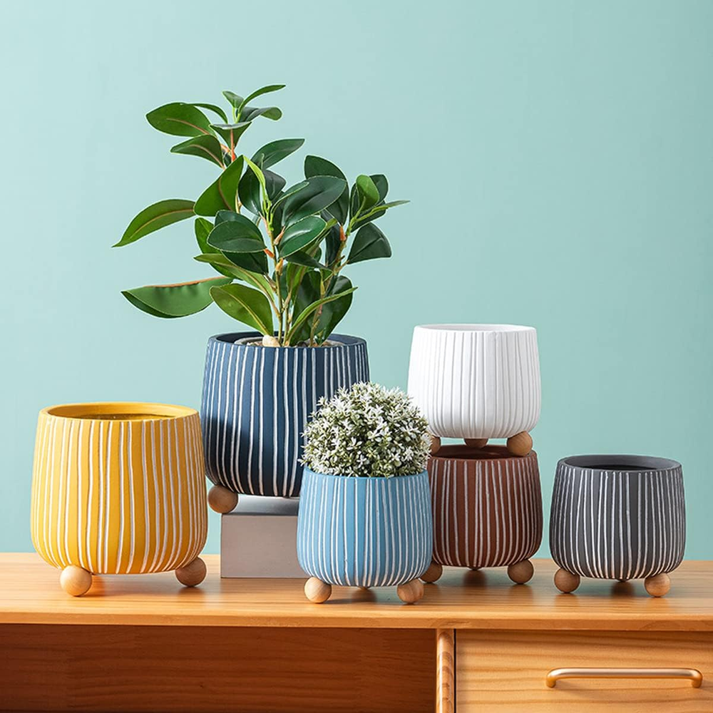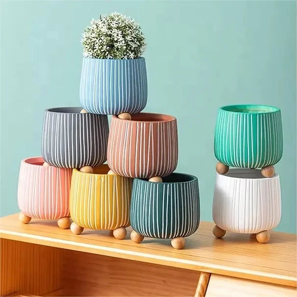 MACETA DE CERAMICA DECORATIVA CON DISEÑO MODERNO CON PATITAS DE MADERA. VIENE SURTIDA DE COLORES