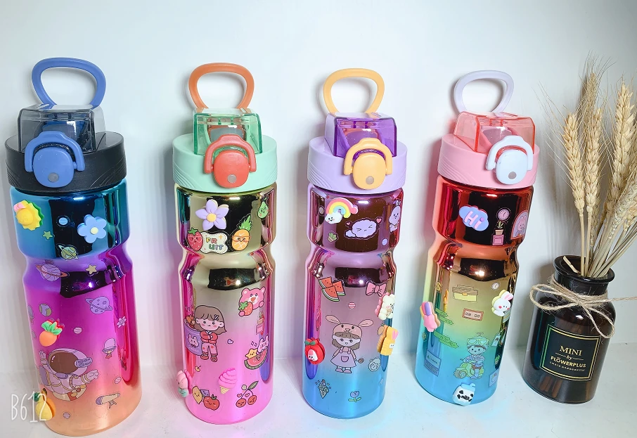 Con agarre, traba de plástico y sorbete retractil Incluye stickers para decorar