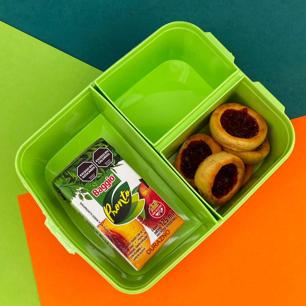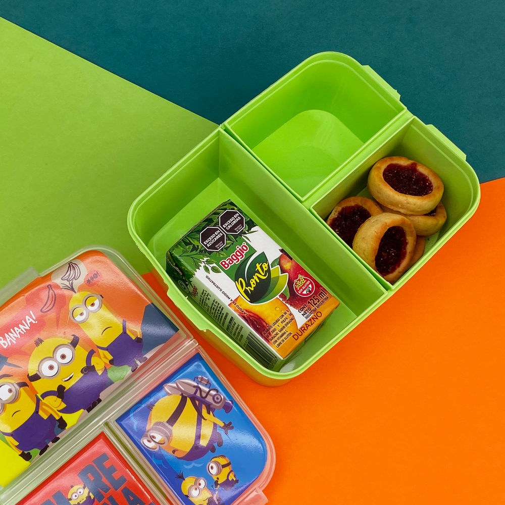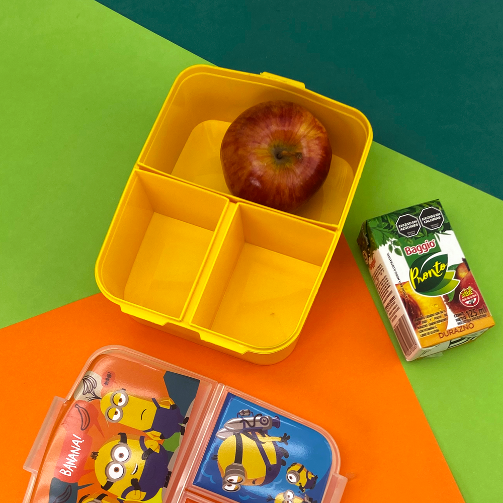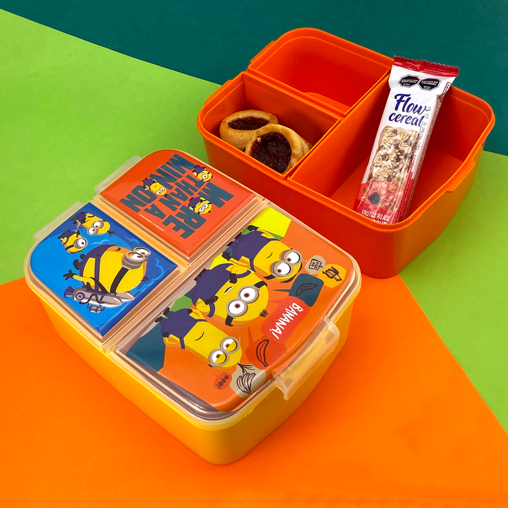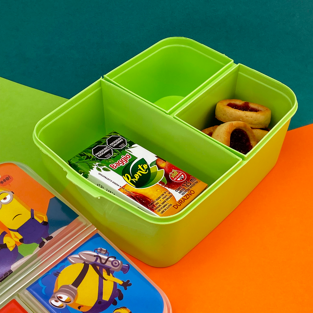 Tapa con cierre a presión, fácil de abrir y manipular. Pote con 3 divisiones separadas por si, 1 grande y 2 chicas. Una gran opción para enviar un desayuno, almuerzo o snack completo y los alimentos no se mezclan entre sí
