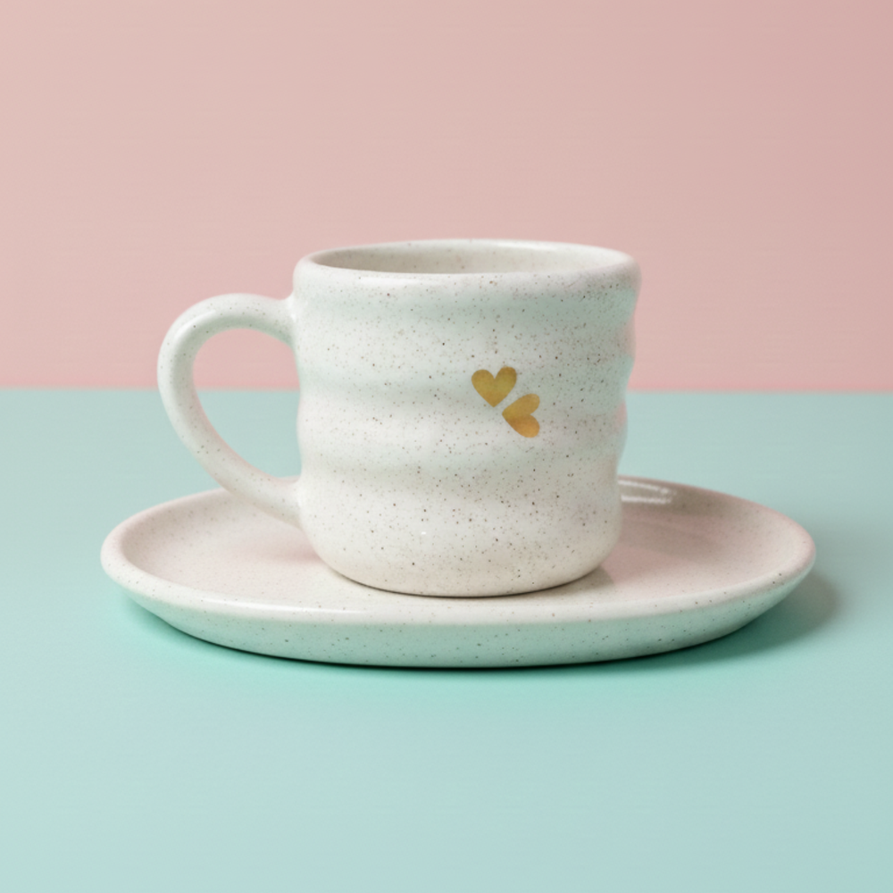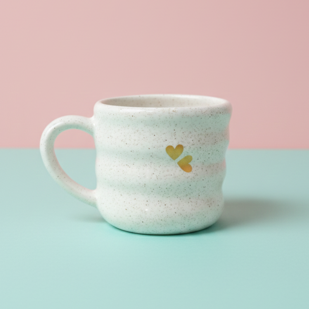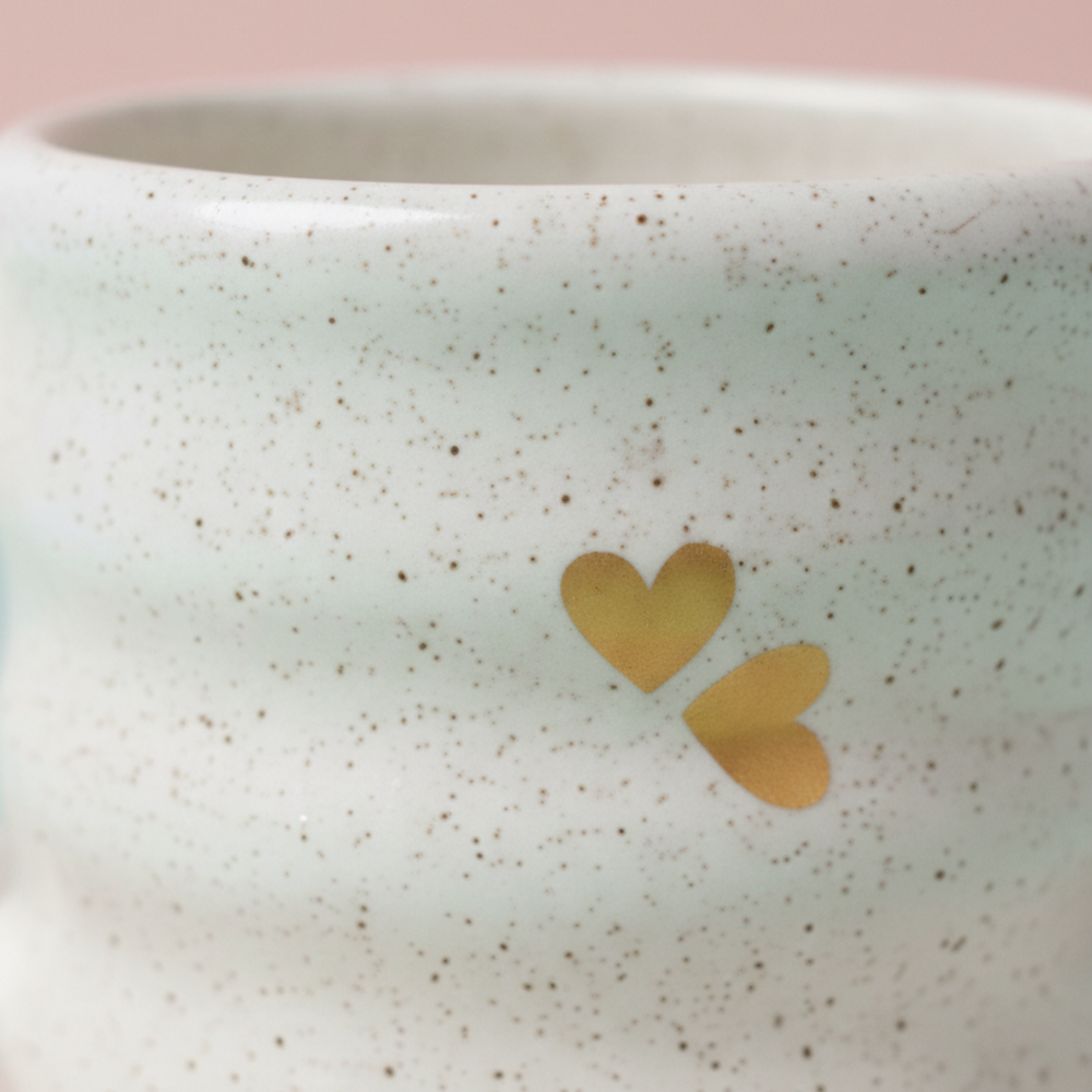 Taza de cerámica en color blanco jaspeado y estampado de corazón
