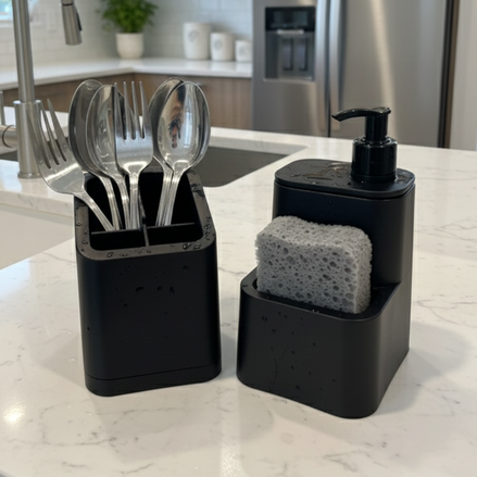 Organizá tu cocina con estilo y responsabilidad con el Set de Cocina, hecho con plástico 100% reciclado. Incluye un dispensador de detergente con espacio para esponja y Escurridor de cubiertos con divisiones removibles. Ideal para mantener tu zona de lavado siempre ordenada y funcional.