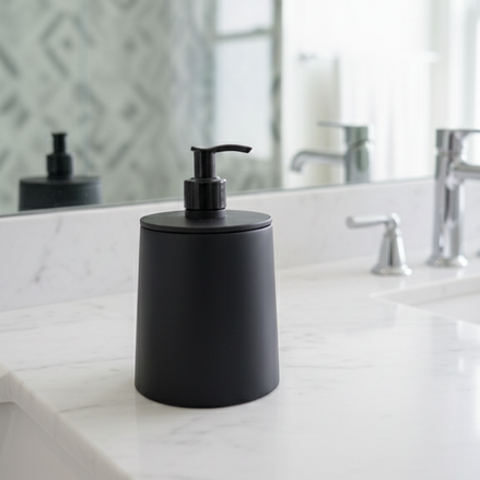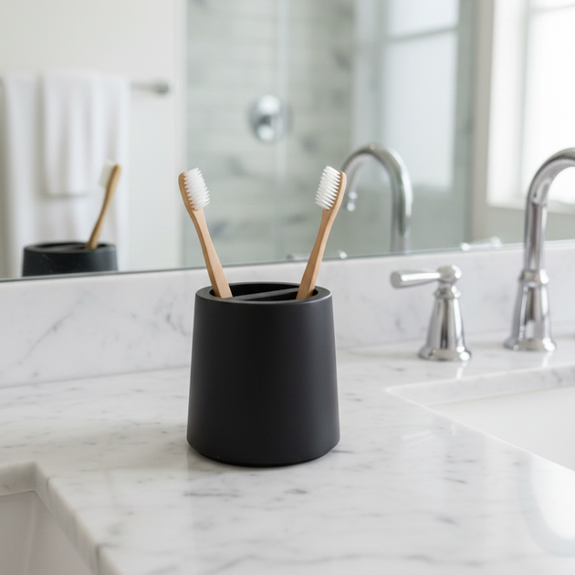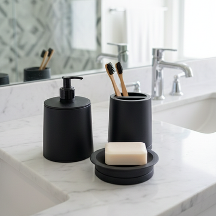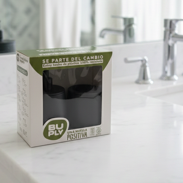 Set de Baño Buply, hecho con plástico 100% reciclado. Este set incluye dispensador de jabón, organizador de cepillos y jabonera, todo en un diseño minimalista y resistente.
