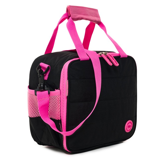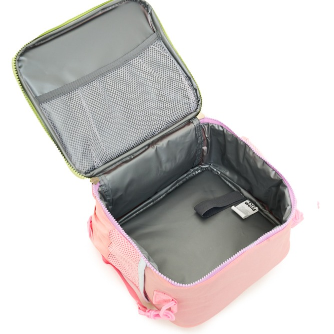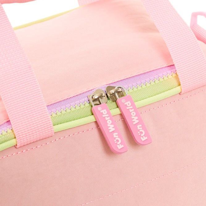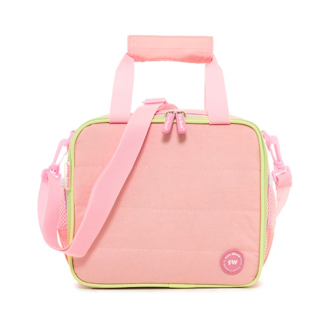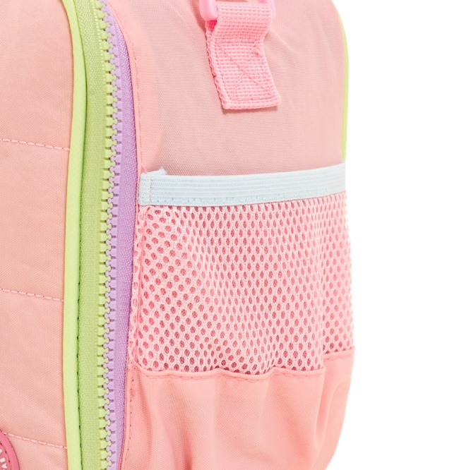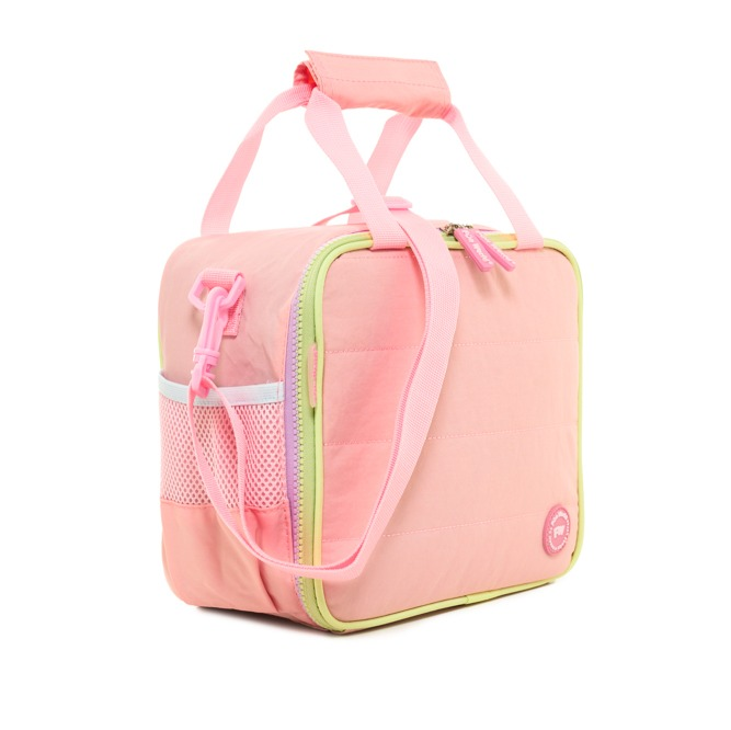 Lunchera candy Tiene una dimension de 232012cm. Apertura 180°. Dos correas cortas de mano con velcro. Correa de hombro ajustable y desmontable. Cinta trasera deslizable para sistema trolley. Interior impermeable y aislante, con elástico para botella y bolsillo de red. Tela matelasse.