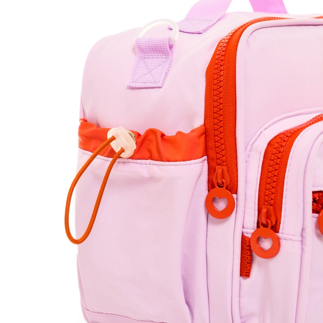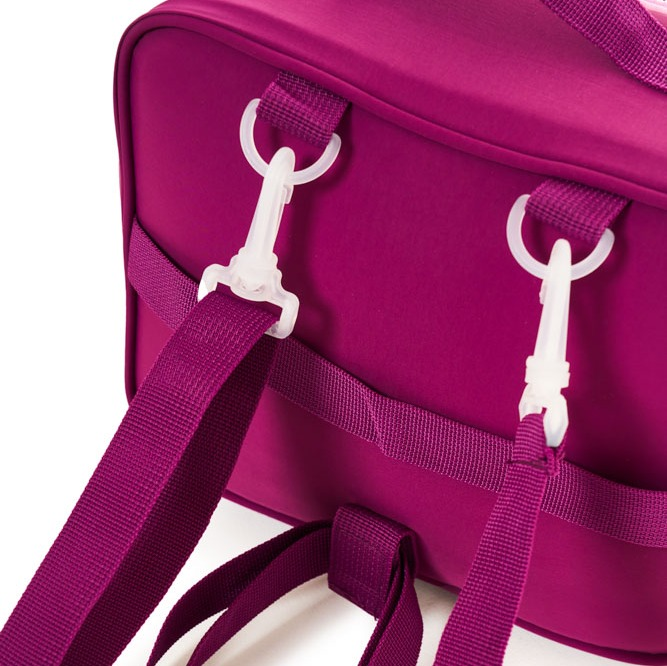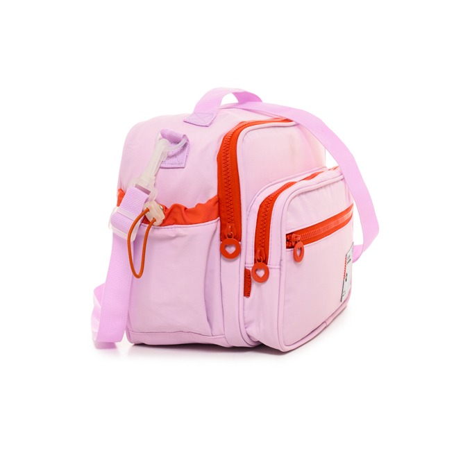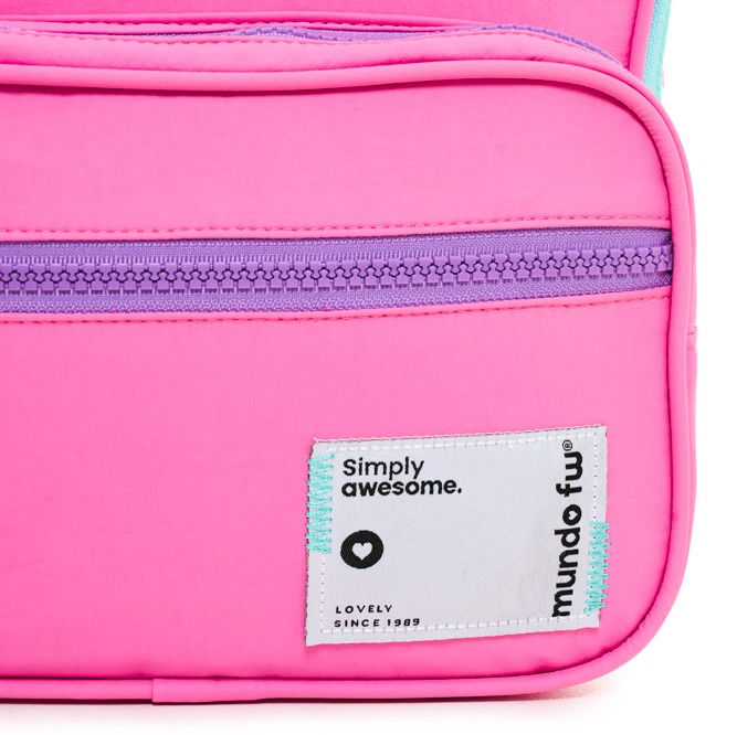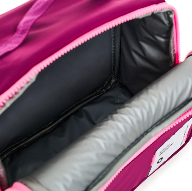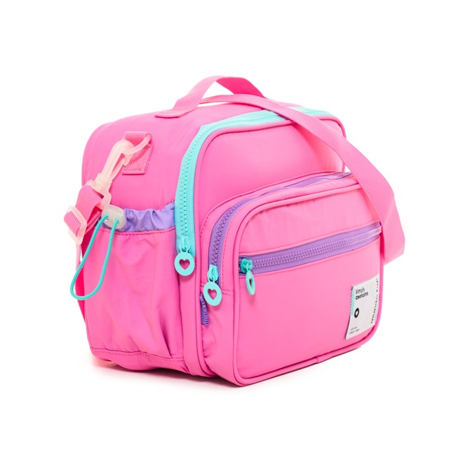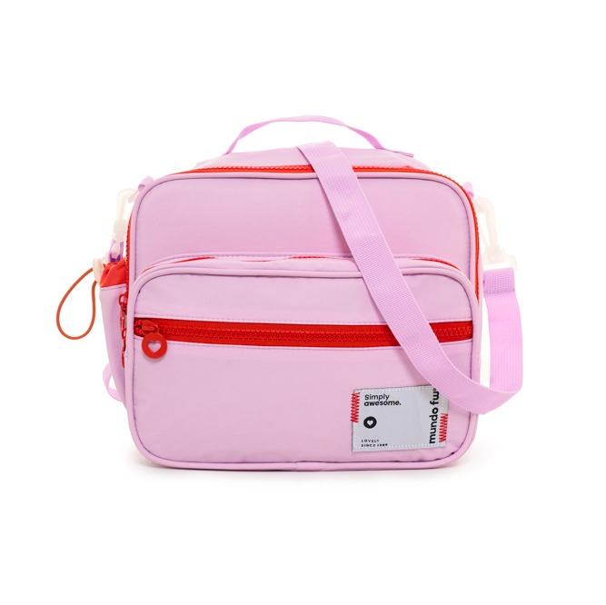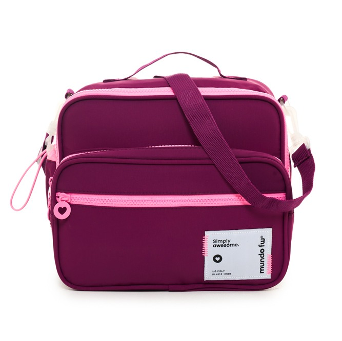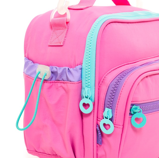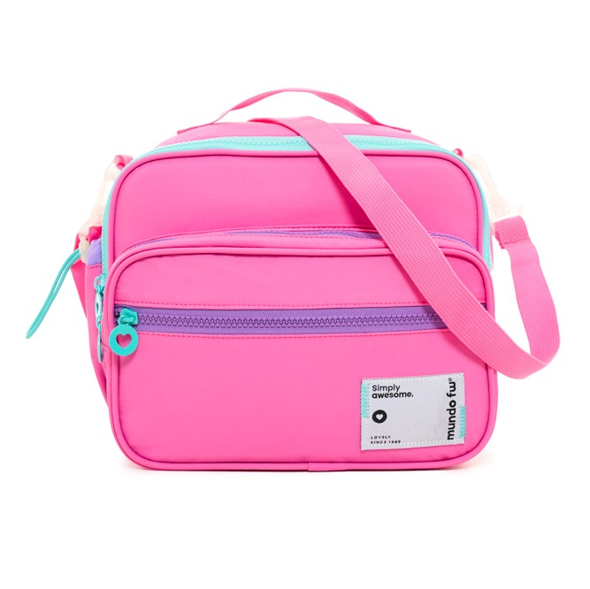Lunchera Sugar Práctica y funcional, ideal para mantener los alimentos frescos durante el día. Es térmica y cuenta con un compartimento principal con tiracierre doble, dos bolsillos frontales con cierre y un bolsillo lateral de tela con elástico ajustable para botella de 500 ml. Incluye manija corta y correa larga desmontable que permite convertirla en mochila. Su interior es impermeable y aislante. Disponible en tres variantes de color: lila, rosa y bordo.