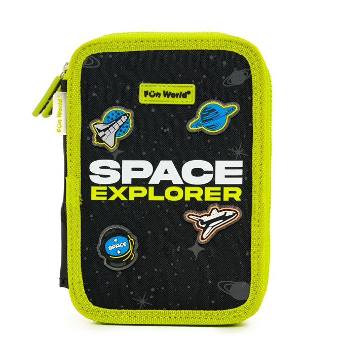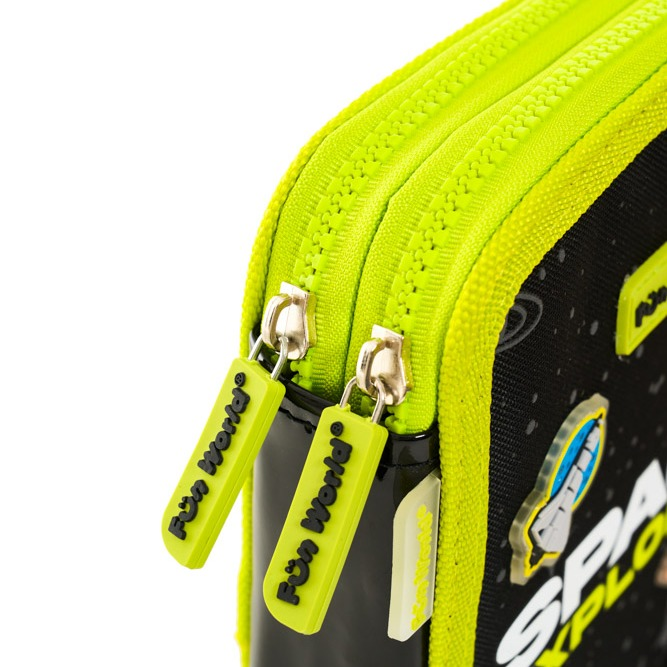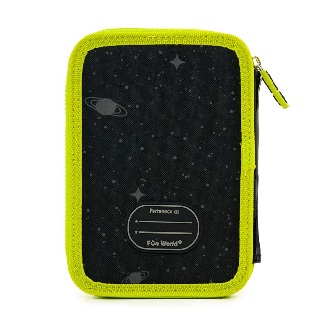 Cartuchera Space 2 Pisos Original y divertida, ideal para los que aman los detalles únicos. Cuenta con 42 elásticos regulares y 2 elásticos anchos, parches de goma que brillan en la oscuridad, name tag y tirador simple. Incluye cierre diente de perro resistente y está disponible en un solo color. Perfecta para organizar tus útiles con estilo y diversión.