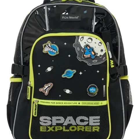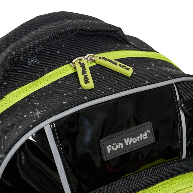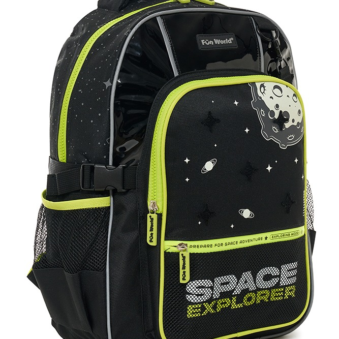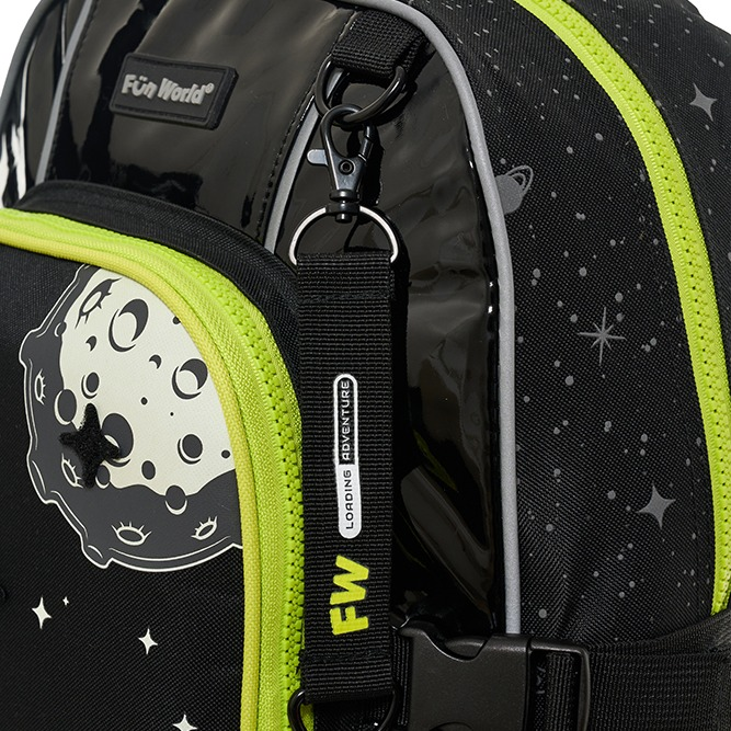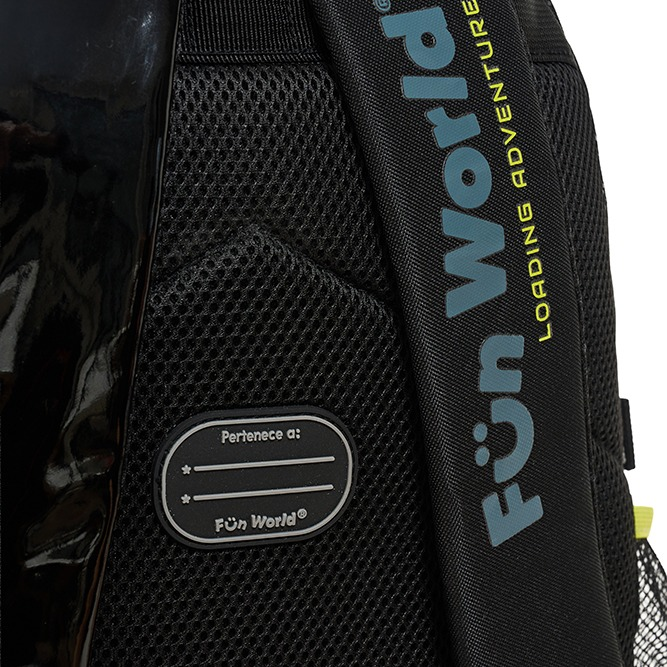 -Parches de goma con velcro intercambiables -Tinta que brilla en la oscuridad -Bolsillo frontal con red y cierre impreso