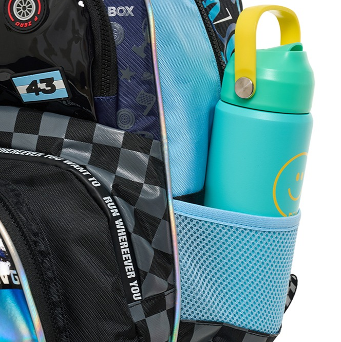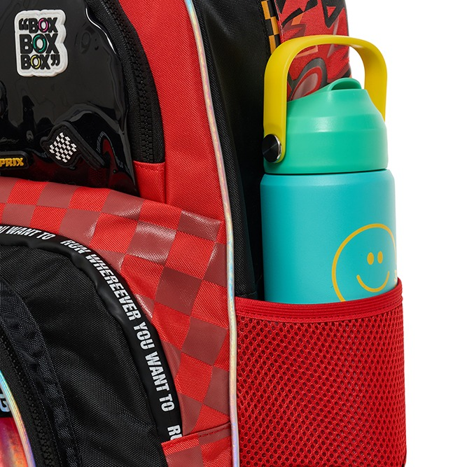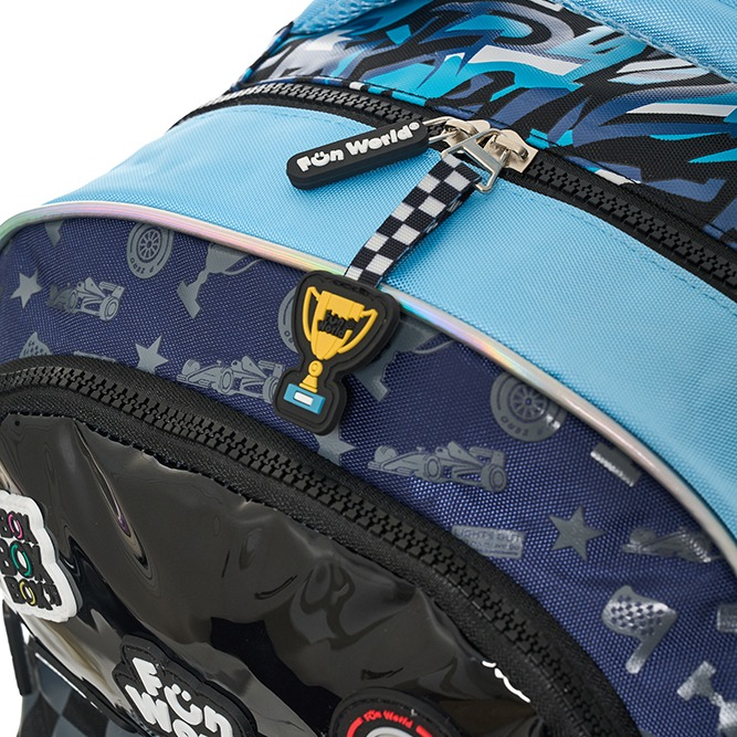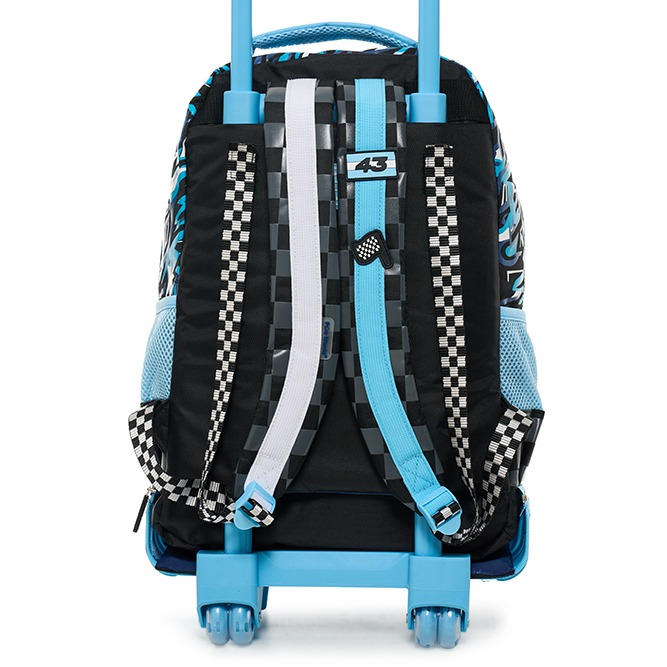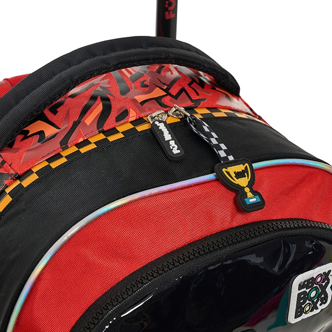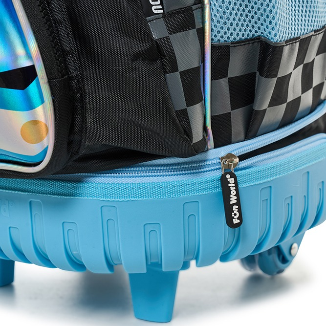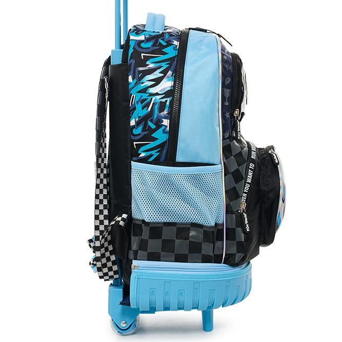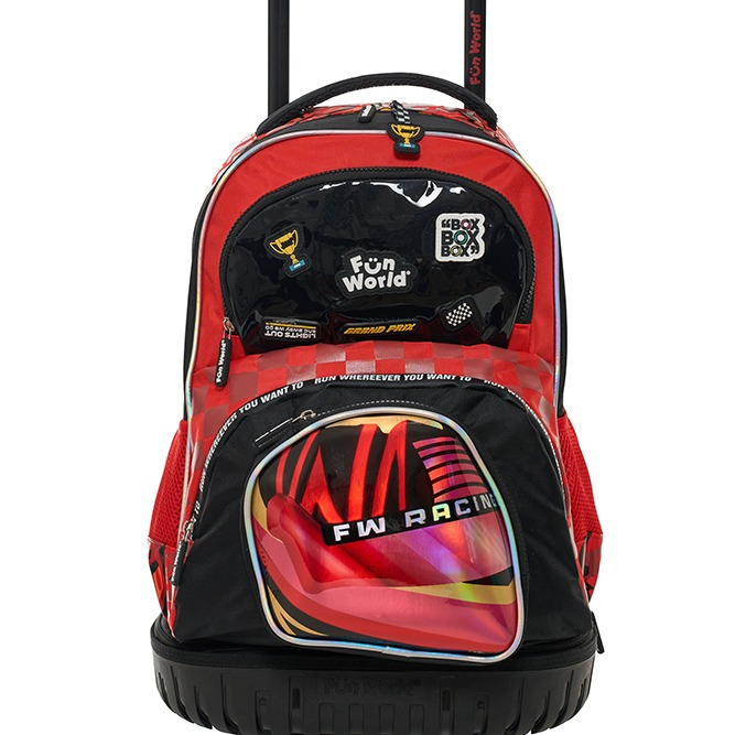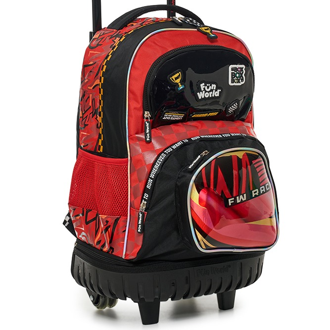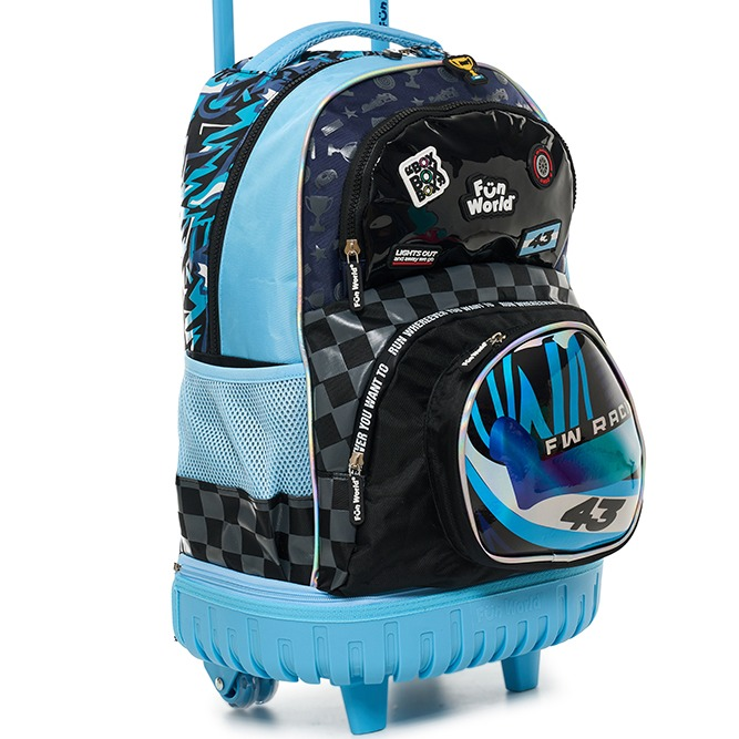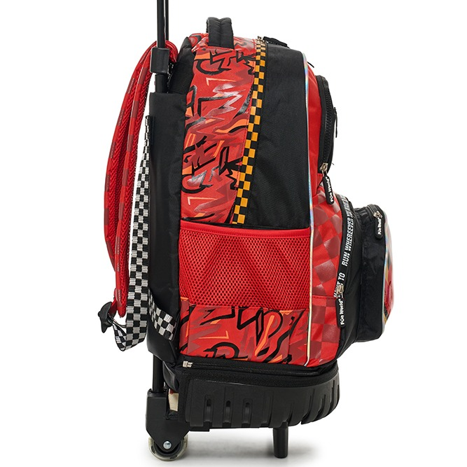 Mochila con carro 18” Race Confeccionada con materiales resistentes y detalles modernos, combina estilo y funcionalidad. Cuenta con parches de goma, bolsillo termoformado holográfico, cierre impreso, varios compartimentos y bolsillos, y dos bolsillos laterales para colocar la botella. Tiene parches cocidos en las correas, que aportan un detalle distintivo y original. El carro es desmontable y reforzado, con dos pares de ruedas dobles que garantizan mayor estabilidad y durabilidad. Disponible en dos variantes de color: celeste y rojo. Ideal para acompañar a los niños cada día con practicidad y comodidad.