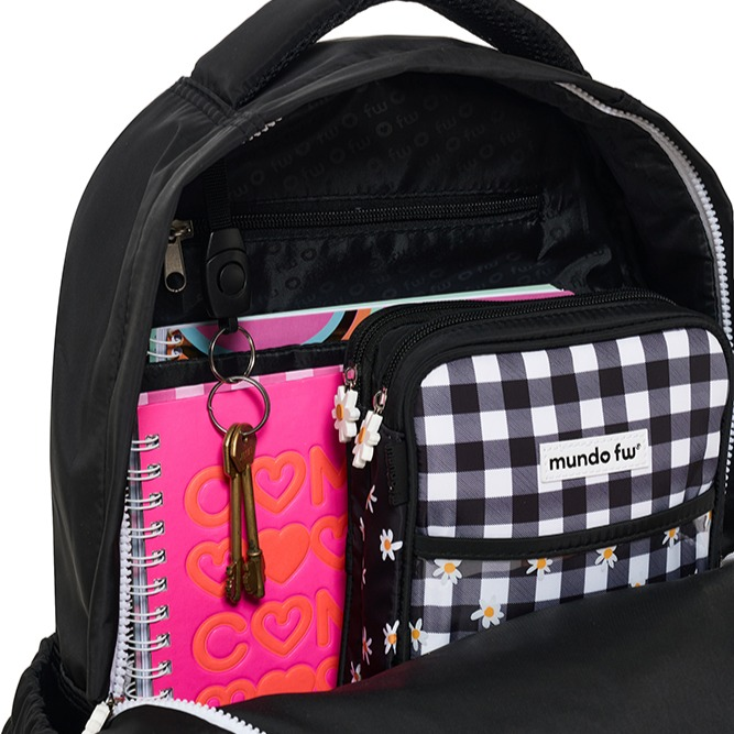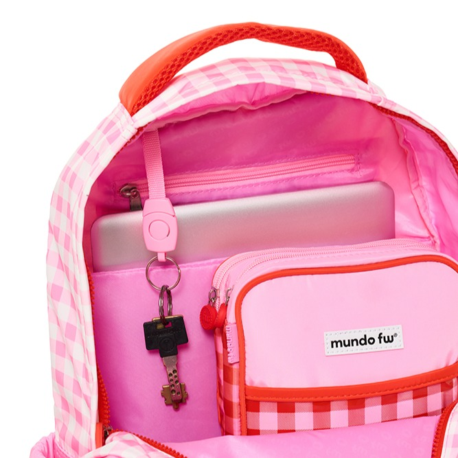Mochila Pop Moderna y versátil, pensada para acompañar el día a día con comodidad y estilo. Cuenta con un compartimento principal con bolsillo interno para notebook, bolsillo con cierre y clip para llaves, además de un segundo compartimento. Incluye dos bolsillos frontales —uno con solapa y otro con cierre—, dos bolsillos laterales y espalda acolchada para mayor confort. Su espalda con sistema air mesh.Disponible en tres variantes de color: rosa con rojo, negro y rosa.