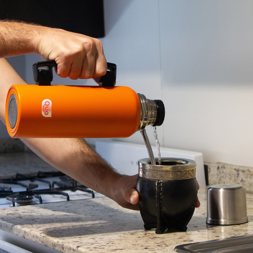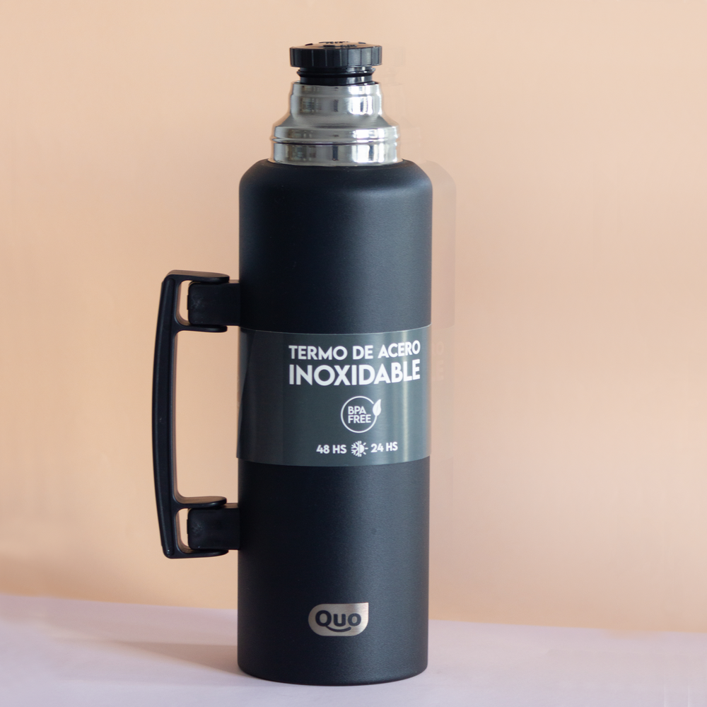 Termo de calidad premium apto frío y calor Doble pared de acero inoxidable 304 Certificado INAL Con manija, tapa hermética y base antideslizante Con packaging y faja