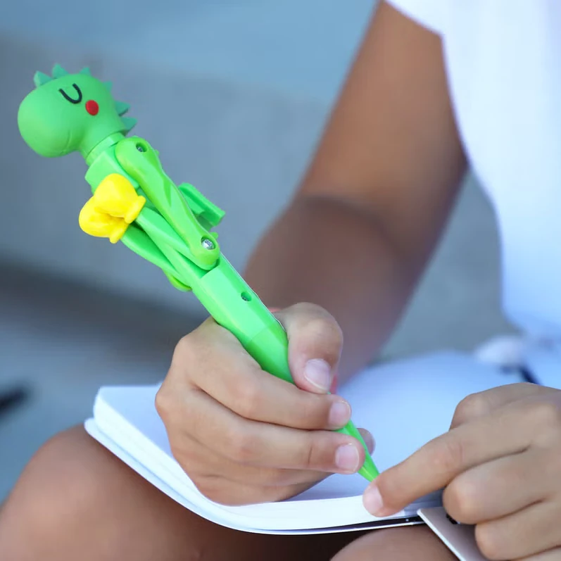 Lapicera verde que en el extremo superior tiene un dinosaurio con brazos y guantes de boxeo.