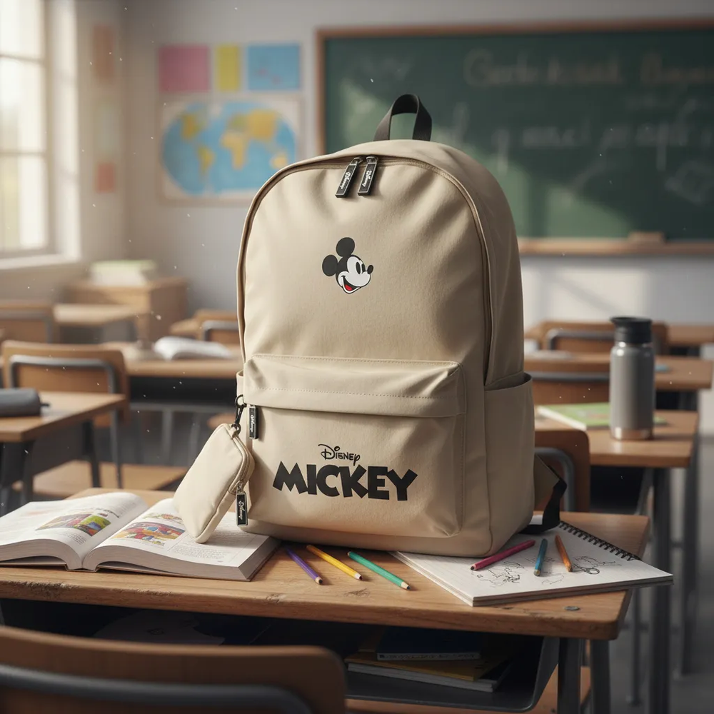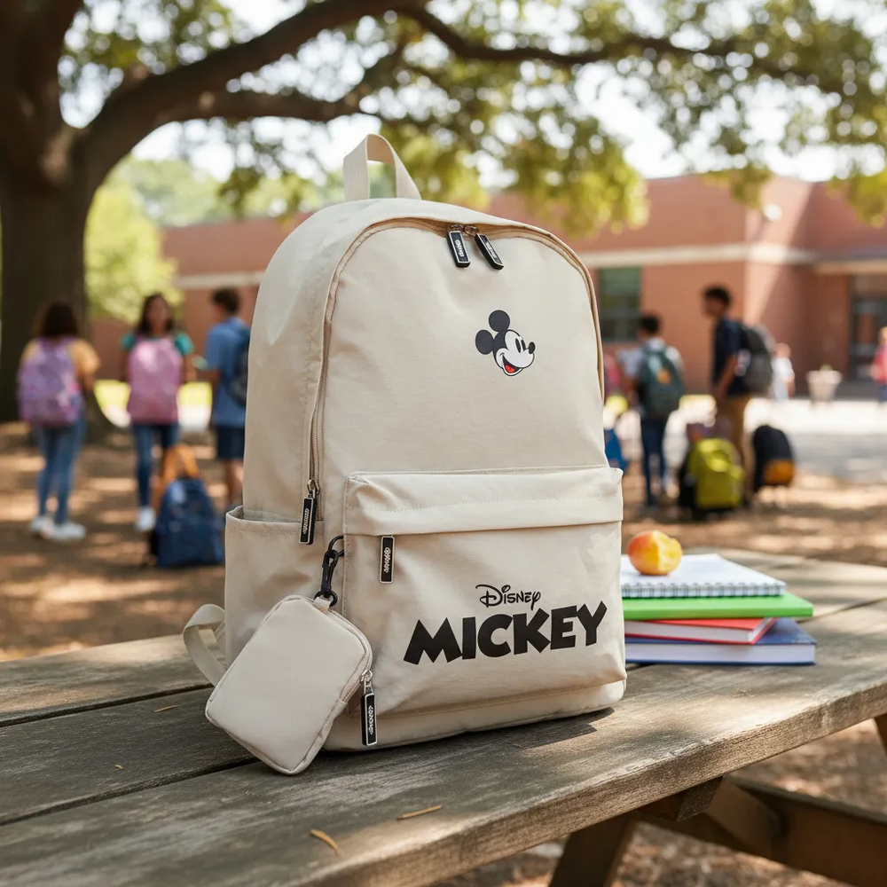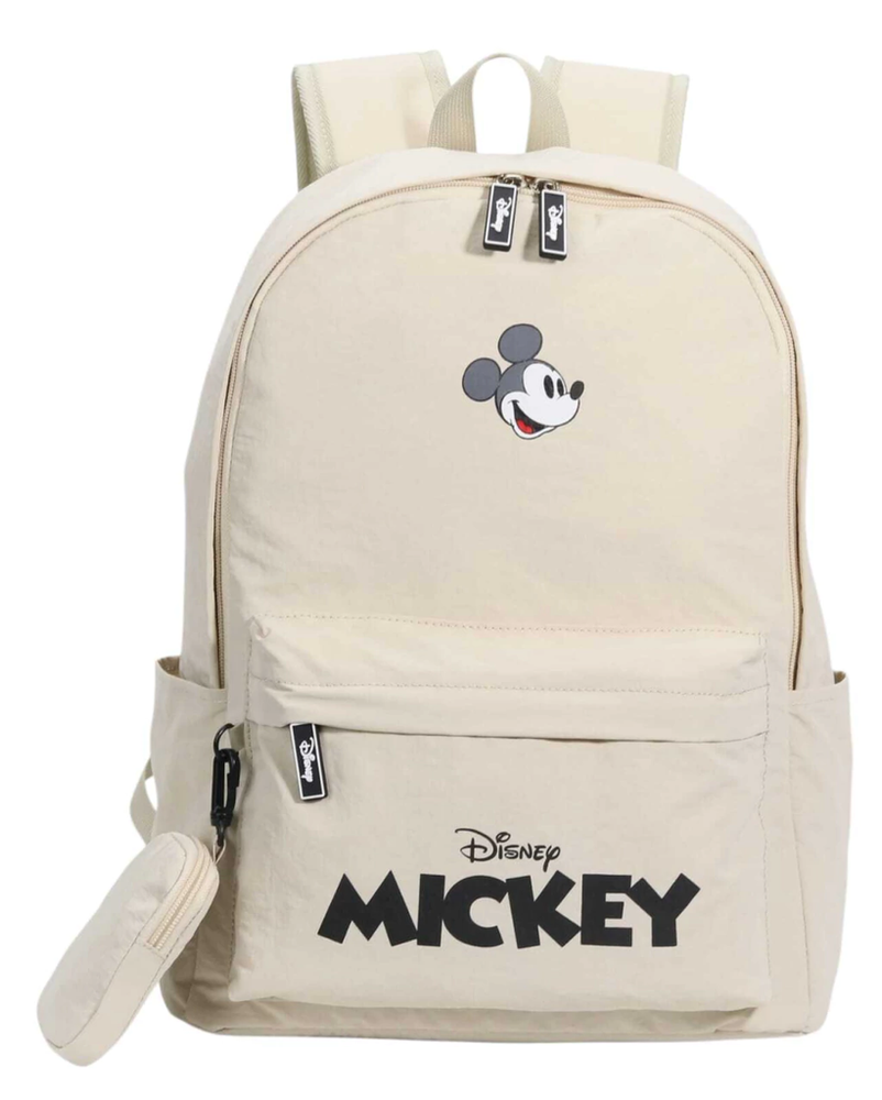 Mochila beige con diseño de mickey y monederito cuadrado.