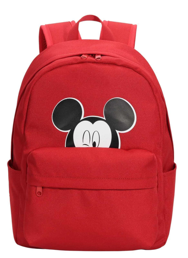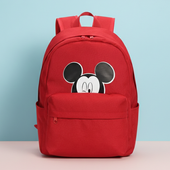 Mochila color rojo con estamapdo de mickey.