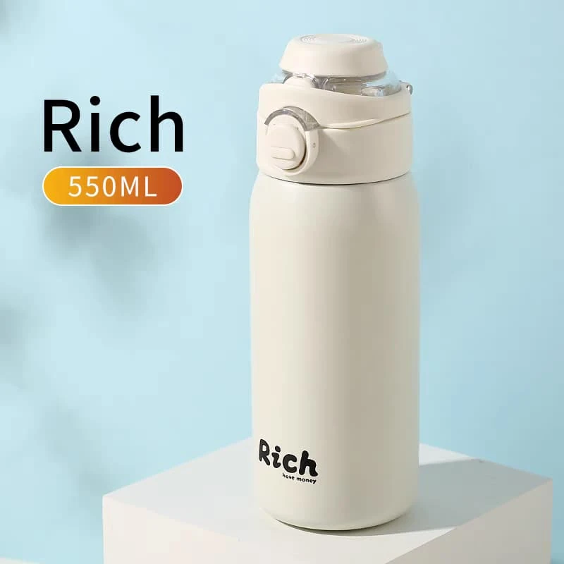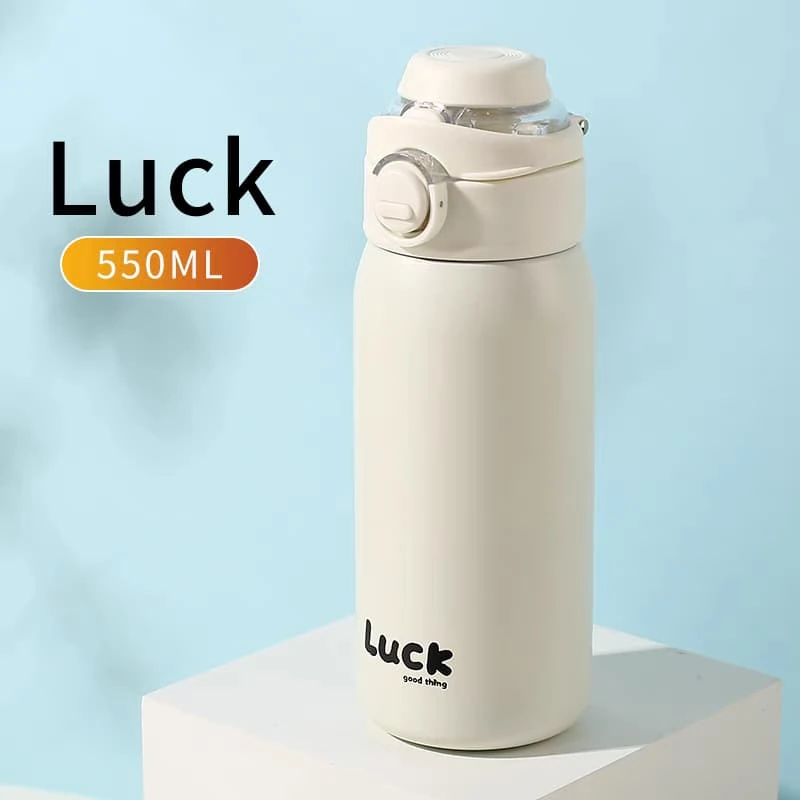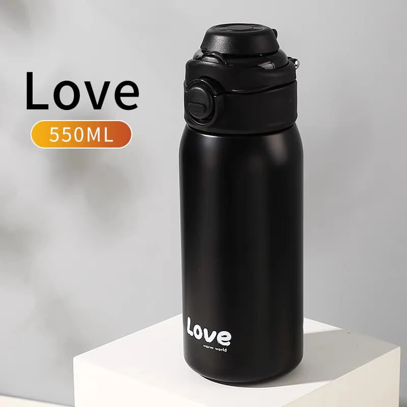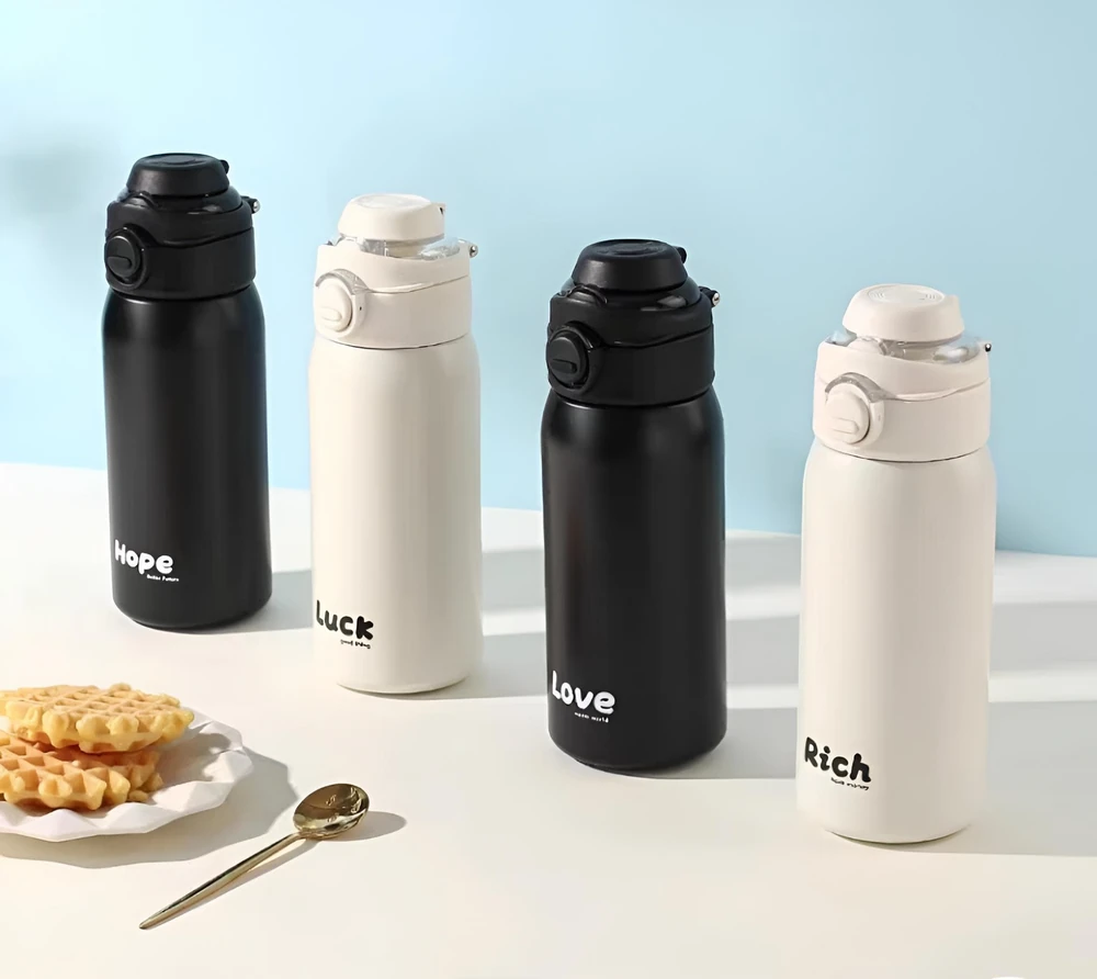 Botella de acero inoxidable disponible en dos colores , fácil de llevar a cualquier y además cuenta con dos picos y sorbete