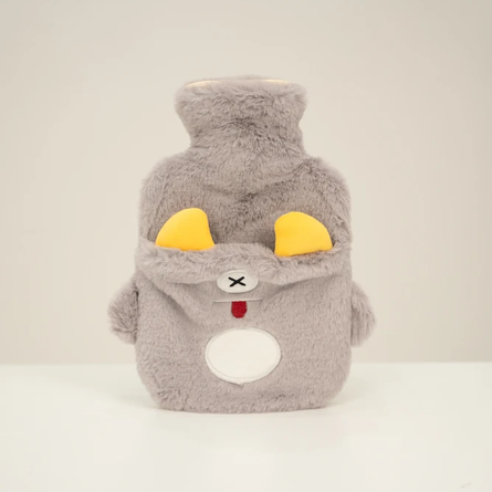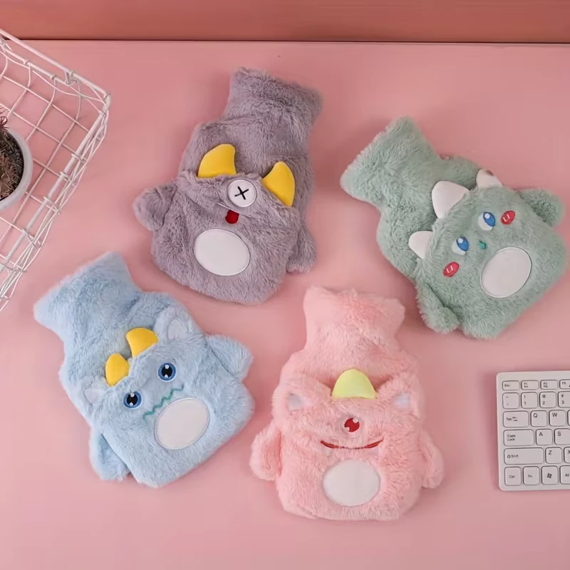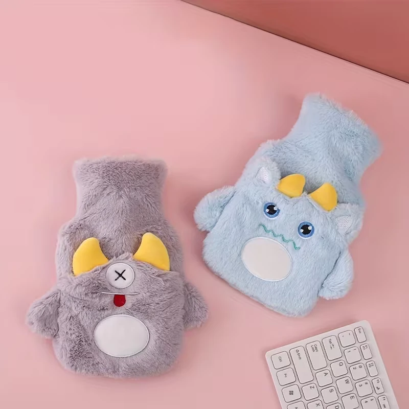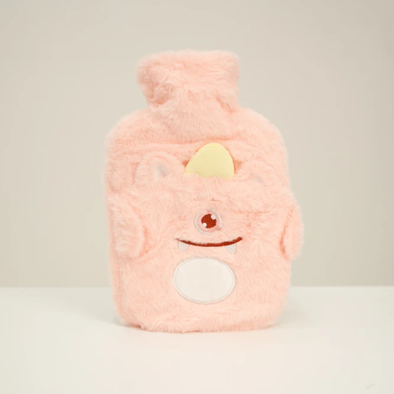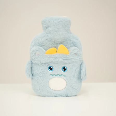 Bolsa de agua caliente plástica con tapón a rosca. Con exterior recubierto por funda de peluche con diseño monstruitos